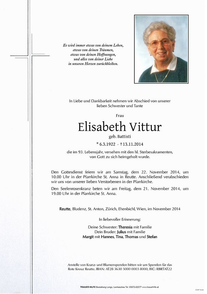 06.03.1922 13.11.2014 Reutte Elisabeth Vittur Action Parte Sterbebild Gedenkkerzen Kondolenzen Parte Sterbebild Gedenkkerzen Kondolenzen Parte herunterladen Sterbebild herunterladen Gedenkkerzen für Elisabeth Vittur 24 Einträge Kerze anzünden Fam. Rosy u. Josef Kohler Familie Battisti Julius SGS Außerfern Daniel P. Emanuela Ruhe in Frieden Marlen Schweiger Hinterbichl Sarah Friedle Ruhe in Frieden Maria Beyrer M. Petrini Wiesenegg Beate Andreas Melekusch Fam. Edi Ammann Fam. Dr. Steppan eine lichtvolle Heimkehr Freude und Frieden für immer Beate Schimana Daniela Rief m. Fam. Angelika Seidel Ruhe in Frieden Ruhe in Frieden Elisabeth Claudia Schreieck TrauerHilfe Bestattung Longo Ihre Gedenkkerze fürElisabeth Vittur Ihr Name* Farbe auswählen Ihre Nachricht oder Name* E-Mail-Adresse* Mit dem Klicken auf "Kerze anzünden" erklären Sie sich mit unseren Datenschutzbestimmungen einverstanden. Kondolenzbuch für Elisabeth Vittur 0 Einträge Kondolenz verfassen Ihr Abschiedsgruß an Elisabeth Vittur Ihr Name* E-Mail-Adresse* Ihre Nachricht* Mit dem Klicken auf "Gruß absenden" erklären Sie sich mit unseren Datenschutzbestimmungen einverstanden.