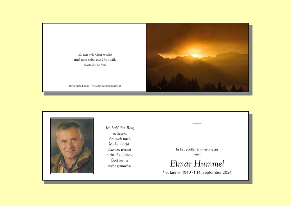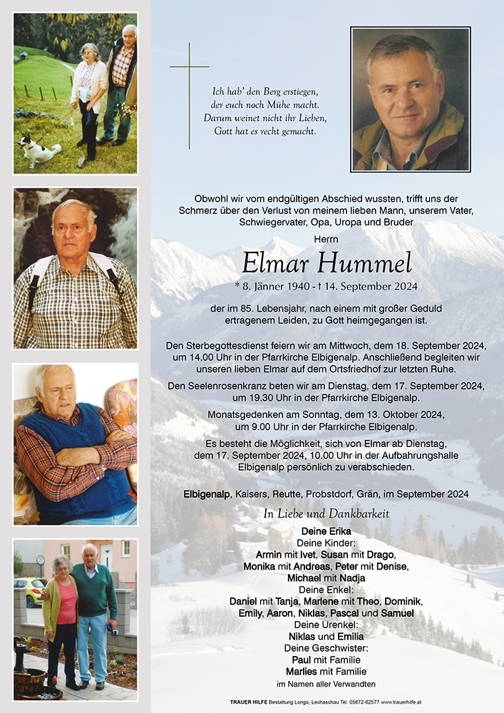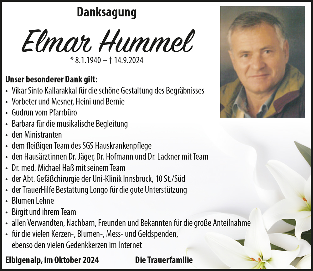 08.01.1940 14.09.2024 Elbigenalp Elmar Hummel Action Parte Sterbebild Gedenkkerzen Kondolenzen Danksagung Parte Sterbebild Gedenkkerzen Kondolenzen Danksagung Parte herunterladen Sterbebild herunterladen Gedenkkerzen für Elmar Hummel 188 Einträge Kerze anzünden zum Jahresgedenken - Annemarie Gerber Du bist nie vergessen! das Osterlicht das Weihnachtslicht das Allerheiligenlicht Wir vermissen dich Dominic, Nadina und Moritz In stillem Gedenken Ruhe in Frieden! Licht und Frieden Du fehlst. Fam. Johann & Silvia Pitschnau Dominic, Nadina und Moritz Michaela und Martin Lorenz Du fehlst. Hannah, Jonas und Moni Danke für alles Papa. Angelika Pohler Stiller Letzter Gruss Hoamatl Höfen.Mayr Fam. Marco & Kathrin Tomes Uhrmacher\'s Erich Daniela Strigl mit Familie Thurner Gerhard und Renate Claudia Moosbrugger Stephi Florian und Vroni Moll Kaisers Lena Walch mit Familie ?? Hab’s fein im Himmel Fam. Mario und Melanie Huber Sabine Scheidle mit Kinder Fam.Harald und Rosmarie Hammerle Fam. M&M Lorenz Walter und Bärbel Hosp, Reutte Familie Anton Specht Anita Jaud Harald Lorenz Paula und Otto Huber Andreas & Lena-Maria Mathilde Schlichtherle-Frey Fam.Stefan Beirer Hermann u Christa Strobl Sieghard und Gabi Posch Ruhe in Frieden, Josef Perle Bolego Daniela Horst und Simone Weirather Hartl Singer - Elbigenalp Ruhe in Frieden! Adolf+Lisi mit Fam. Richard und Gertrud Jäger Karin und Wolfi Moosbrugger Erika Praxmair Franz Wolf, Lechaschau Anna-Lena & Martin Winkler Irmgard & Matthias Rief Dagmar&Martin Elisabeth und Franz Lang Thomas und Martina Moosbrugger Holzgau Peter Steiner, Reutte Ruhe in Frieden Leopold und Andrea Ulsess Burkhard und Elli Steeg Martina + Raimund Roland Maldoner-Jäger Singer Maria mit Familien Fam. Maldoner-Jäger Ruhe in Gottes Geborgenheit. Christoph Baldauf mit Familie Willi & Tanja, Aaron & Elena Julian & Romana mit Emilia Ruhe in Frieden... Elmar und Grete Wolf Fam. Klaus u. Dagmar Wasle Fam. Steinberger M. Karl Neuner Gerda Singer Neuner Petra Spannbauer mit Familie ?️? Hermann und Annelies Friedle Hinterhornbach Helmut und Christina Scheidle Christoph,Martina, Lena&Mona Team des SGS Außerfern Ruhe in Frieden Fam.Herlinde u.Peter Hummel Christian & Hildegard Lechleitner Ivana Busic Fam. Toni u. Gudrun Hofmann Fam. Roland und Claudia Strobl Günther u. Berta Walch Jessica ?️ Wolfgang und Manuela Andreas und Karin Sprenger Melanie Wex Fam.Winkler Hugo u. Hildegard Grießau REINHARD BERTLMANN Nadja und Rita Drexel ? Fam. Paul Kaiser Hans-Peter oder Renate Strobl Ruhe in Frieden Fam. Schuler Franz u. Monika Birgit Aldrian-Holzner Josef und Anita Walch-Lang Dagmar und Vanessa Kerber Imelda Kerber Hilde und Fritz anrauth Fam. Dagmar Haider Markus Hosp Fam.Dietmar und Martina Lumpert Kathrin Horvath mit Familie Marion Höller-Lorenz mit Kinder Fam. Jäger Birgit Doris Wex Christiane Ginther Monika und Walter Bischof Fam. Roland Kaufmann Fam. Johann & Silvia Pitschnau Elmar und Burgi mit Nico und Lukas Margreth Rauth -Zangerl Barbist Martin und Yvonne Andreas und Sigrid Matti Fam. Karl Klotz und Elfriede Ladebeck Inge und Karl Elfriede und Franz mit Familie Selli & Christine, Steeg Ruhe in Frieden Wolf Franz u.Silvia Fam. Pippan Daniel Fam. Karin & Robert Schmidt Reinhard Lechleitner Fam. Andrea Lämmle Friede sei mit Dir Verena Scheucher Klaudia & Reinhard Sonja und Mike Rémon Monika Norbert philipp Fam. Markus & Andrea Brandmayer Manfred und Hanni Mages Pfiat Di Elmar - Annemarie Gerber Maria mit Familie Petra Strauß Sabine und Christian mit Jana und Fabian Fam. Ilse Schlux Elbigenalp Mario und.Barbara Rief Irene und Barbara Wolf Monika Deutschmann-Reinisch Evi Lorenz Ruhe in Frieden Evi Lorenz Fam. Dobler, E‘alp Gerhard und Geli Ulseß Fam.Lotte u.Manfred Fertner Jessica & Günther Manuela und Marcel mit Romy und Greta Fam. Lorenz Bernd & Petra Fam. Dunja Dobler Christian Dietz Senioren Häselgehr Fam. Hubert und Erika Wasle Fam.Klaus und Gitti Friedl Lang Gerda Carmen und Markus mit Jana und Simon Ruhe in Frieden Herbert und Marion Lang Ernst Zotz Fam. Karin & Markus Lorenz Hildegard und Walter Frey Familie Rebecca Stark Ein Licht aus Höfen Patrick mit Familie Marlies und Richard Fam. Erwin u. Sonja Haider Rainer und Silvia Wolf Manfred & Claudia Andreas Scheidle Familie Harald Kaiser Herbert Müller Familie Edi & Annigret Höck Larcher Heike, Rainer & Janine Fam. Angelika u. Jürgen Perle Fam. Sabine & Rainer Lechleitner Familie Friedle - Martinau Familie Ulseß Paul und Melanie mit Lea,Leon Verena und Florian Hofmann Martina & Ossi Pescosta Dominic, Nadina und Moritz Fam.Singer Heini u. Marlies Griessau Franz Kohler und Monika Dobler Rainer u. Marlies Heel mit Fam. Gebhard und Julia Mages Grünau ?️? Seppl und Marianne Pitschnau Rainer Müller mit Familie Marion Moebus Ehenbichler Fam. Seppl und Johanna Falger Duarf Harald Felsberger Im stillen Gedenken Kerber Manuela Mein Beileid Irmgard Claudia Schreieck TrauerHilfe Bestattung Longo Ihre Gedenkkerze fürElmar Hummel Ihr Name* Farbe auswählen Ihre Nachricht oder Name* E-Mail-Adresse* Mit dem Klicken auf "Kerze anzünden" erklären Sie sich mit unseren Datenschutzbestimmungen einverstanden. Kondolenzbuch für Elmar Hummel 1 Eintrag Kondolenz verfassen Es ist so schwer einen lieben Menschen zu verlieren. In unserem Herzen lebt er weiter. Die Erinnerung bleibt und gibt uns Trost und Hoffnung. Paul und Melanie 16.09.2024 um 14:41 Uhr Ihr Abschiedsgruß an Elmar Hummel Ihr Name* E-Mail-Adresse* Ihre Nachricht* Mit dem Klicken auf "Gruß absenden" erklären Sie sich mit unseren Datenschutzbestimmungen einverstanden. Danksagung herunterladen