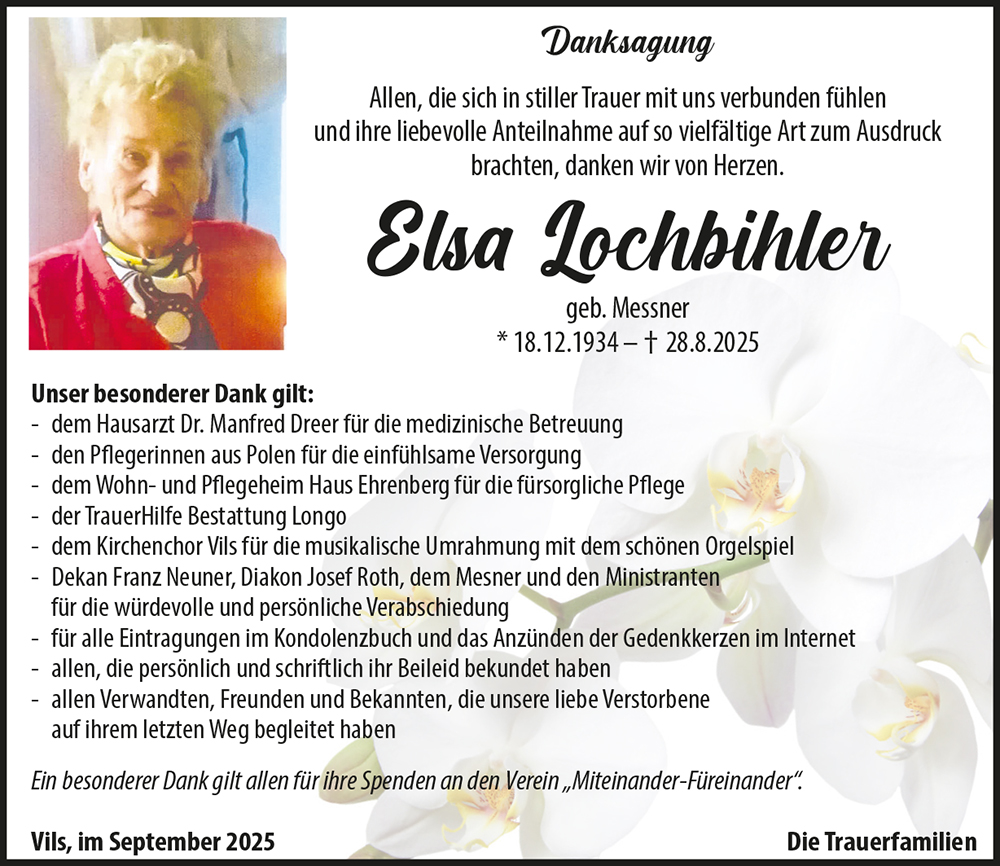 Vielen herzlichen Dank für die immer überaus netten und lustigen Stunden bei Dir zuhause und mit Deinem inzwischen verstorbenem Lebenspartner Toni, sowie all Deinen überaus netten Pflegerinnen Monica + Maria + Maya + Elzbieta + Alina, die uns alle, immer wieder zum Lachen brachten. Dasselbe gilt natürlich auch allen liebevollen Pfleger:innen im Pflegeheim Haus Ehrenberg (ab Pfingsten 2024) und im Haus Sintwag (seit Mai 2025). Aber auch Deine lieben Verwandten und viele Gäste waren immer wieder sehr gerne Gast bei Dir zuhause in Vils.