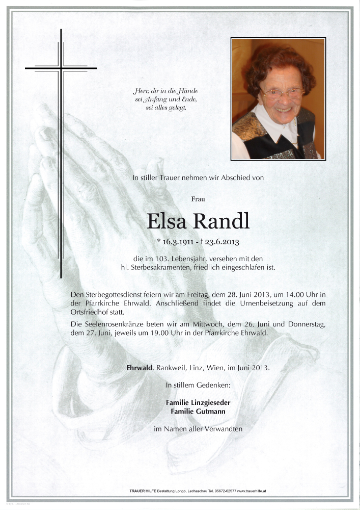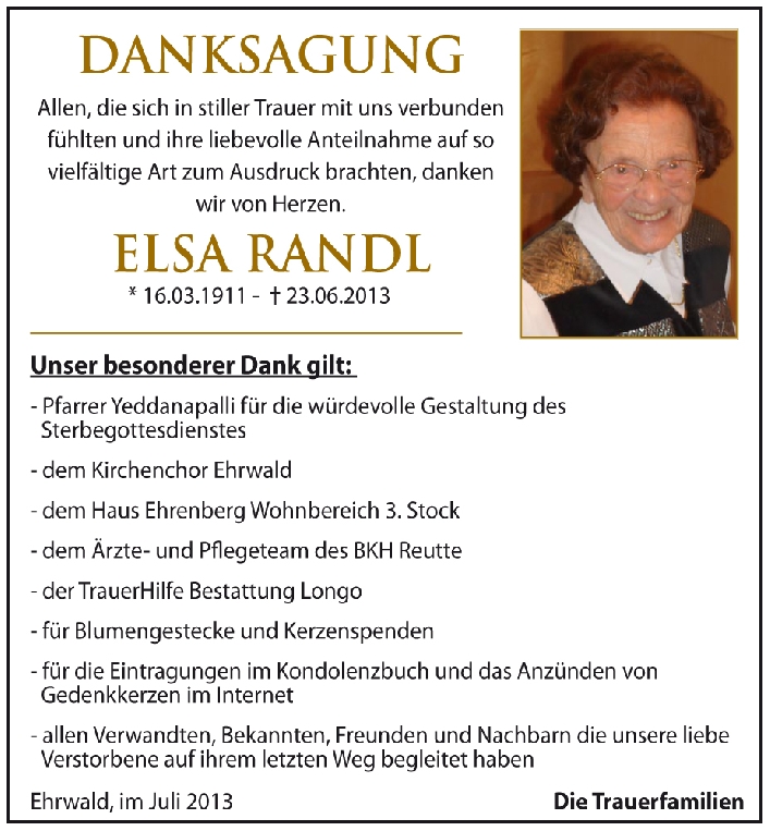 16.03.1911 23.06.2013 Ehrwald Elsa Randl Action Parte Sterbebild Gedenkkerzen Kondolenzen Danksagung Parte Sterbebild Gedenkkerzen Kondolenzen Danksagung Parte herunterladen Sterbebild herunterladen Gedenkkerzen für Elsa Randl 55 Einträge Kerze anzünden Fam. Netti und Thomas Fuchs Ruhe in Frieden In lieber Erinnerung! ruhe in Frieden Maria Fam. Köck Paul Renate u. Juli Fam. G. Somweber /I. Prinz Anni Somweber(Gallus) Fam. Donner Fam. Riml Sölden Brigitte Kößler mit Fam. Familie Ancona Somweber Maria u. Manfred Der Herr ist dein Hirte Familie Anita Gstrein Helene Guem In stillem Gedenken Nadine, Markus und Anna-Lena In liebem Gedenken Maria & Gün Anni Somweber (Mesmer) mit Fam Familie Annelore Zotz Birgit Baumgartner Helene Wendlinger Elke und Wilfried Fam. Johann Köck Fam. Patrick Wilhelm Inge Birkl Fam. Josef Vögele Haus Ehrenberg WB 3 ruhe in Frieden Maria Franz u. Regina Hirtenfelder Fam. Wilhelm Christane Barbara und Peter Hofherr Michaela & Herbert Suitner Fam. Razenberger Ruhe i. Frieden Frieda Mair Stricker Erna Pirner Alfred Kieke und Hansjörg Spielmann Waltraud Waltraud Beate Fam. Inge Wilhelm Ehrwald Sabine Berktold Ruhe i. Frieden Familie Florian Spielmann Fam. Olga Kerber Ruhe in Frieden Ruhe in Frieden, Rita Gruber Lettenbichler Elisabeth Ruhe in Frieden Angelika Ruhe in Gottes Geborgenheit Jasmin Viel Liebe, Licht und Frieden Marlies und Marco Wilhelm Haas Elisabeth Ihre Gedenkkerze fürElsa Randl Ihr Name* Farbe auswählen Ihre Nachricht oder Name* E-Mail-Adresse* Mit dem Klicken auf "Kerze anzünden" erklären Sie sich mit unseren Datenschutzbestimmungen einverstanden. Kondolenzbuch für Elsa Randl 0 Einträge Kondolenz verfassen Ihr Abschiedsgruß an Elsa Randl Ihr Name* E-Mail-Adresse* Ihre Nachricht* Mit dem Klicken auf "Gruß absenden" erklären Sie sich mit unseren Datenschutzbestimmungen einverstanden. Danksagung herunterladen