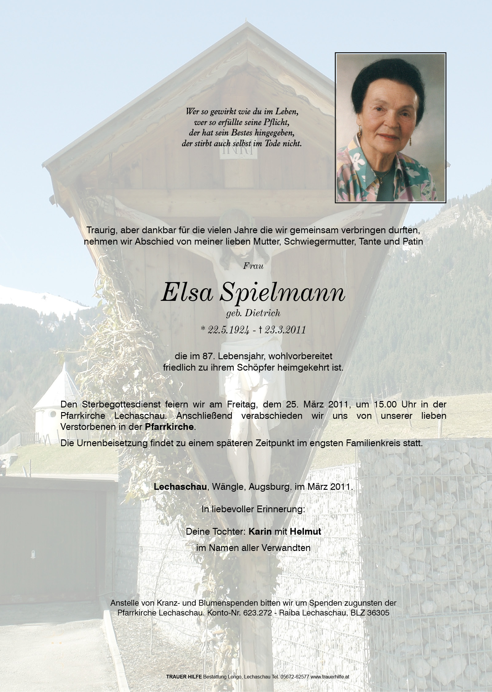 13.12.1901 23.03.2011 Lechaschau Elsa Spielmann Action Parte Sterbebild Gedenkkerzen Kondolenzen Danksagung Parte Sterbebild Gedenkkerzen Kondolenzen Danksagung Parte herunterladen Sterbebild herunterladen Gedenkkerzen für Elsa Spielmann 5 Einträge Kerze anzünden Ein Licht für die Ewigkeit! Ingrid Posch Weißenbach Jahr. Ged. Posch Ingrid Wbch. Renate Praxmair Rita Gruber Ihre Gedenkkerze fürElsa Spielmann Ihr Name* Farbe auswählen Ihre Nachricht oder Name* E-Mail-Adresse* Mit dem Klicken auf "Kerze anzünden" erklären Sie sich mit unseren Datenschutzbestimmungen einverstanden. Kondolenzbuch für Elsa Spielmann 1 Eintrag Kondolenz verfassen Herr, Dir in die Hände sei Anfang und Ende, sei Alles gelegt. Jahr.Ged. Posch Ingrid Wbch. 29.03.2012 um 08:56 Uhr Ihr Abschiedsgruß an Elsa Spielmann Ihr Name* E-Mail-Adresse* Ihre Nachricht* Mit dem Klicken auf "Gruß absenden" erklären Sie sich mit unseren Datenschutzbestimmungen einverstanden. Danksagung herunterladen