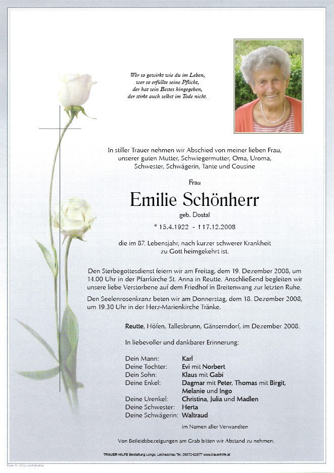 13.12.1901 17.12.2008 Reutte Emilie Schönherr Action Parte Gedenkkerzen Kondolenzen Parte Gedenkkerzen Kondolenzen Parte herunterladen Gedenkkerzen für Emilie Schönherr 1 Eintrag Kerze anzünden Ein Licht für die Ewigkeit! Ihre Gedenkkerze fürEmilie Schönherr Ihr Name* Farbe auswählen Ihre Nachricht oder Name* E-Mail-Adresse* Mit dem Klicken auf "Kerze anzünden" erklären Sie sich mit unseren Datenschutzbestimmungen einverstanden. Kondolenzbuch für Emilie Schönherr 0 Einträge Kondolenz verfassen Ihr Abschiedsgruß an Emilie Schönherr Ihr Name* E-Mail-Adresse* Ihre Nachricht* Mit dem Klicken auf "Gruß absenden" erklären Sie sich mit unseren Datenschutzbestimmungen einverstanden.