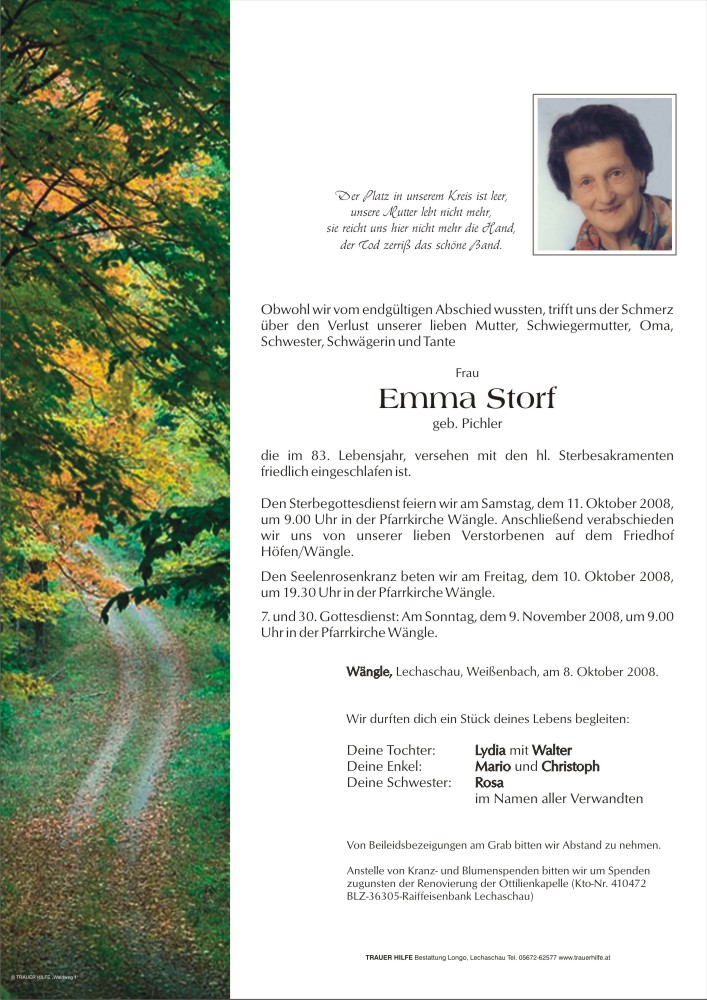 13.12.1901 08.10.2008 Wängle Emma Storf Action Parte Gedenkkerzen Kondolenzen Parte Gedenkkerzen Kondolenzen Parte herunterladen Gedenkkerzen für Emma Storf 1 Eintrag Kerze anzünden Ingrid Posch Wbch. Ihre Gedenkkerze fürEmma Storf Ihr Name* Farbe auswählen Ihre Nachricht oder Name* E-Mail-Adresse* Mit dem Klicken auf "Kerze anzünden" erklären Sie sich mit unseren Datenschutzbestimmungen einverstanden. Kondolenzbuch für Emma Storf 0 Einträge Kondolenz verfassen Ihr Abschiedsgruß an Emma Storf Ihr Name* E-Mail-Adresse* Ihre Nachricht* Mit dem Klicken auf "Gruß absenden" erklären Sie sich mit unseren Datenschutzbestimmungen einverstanden.