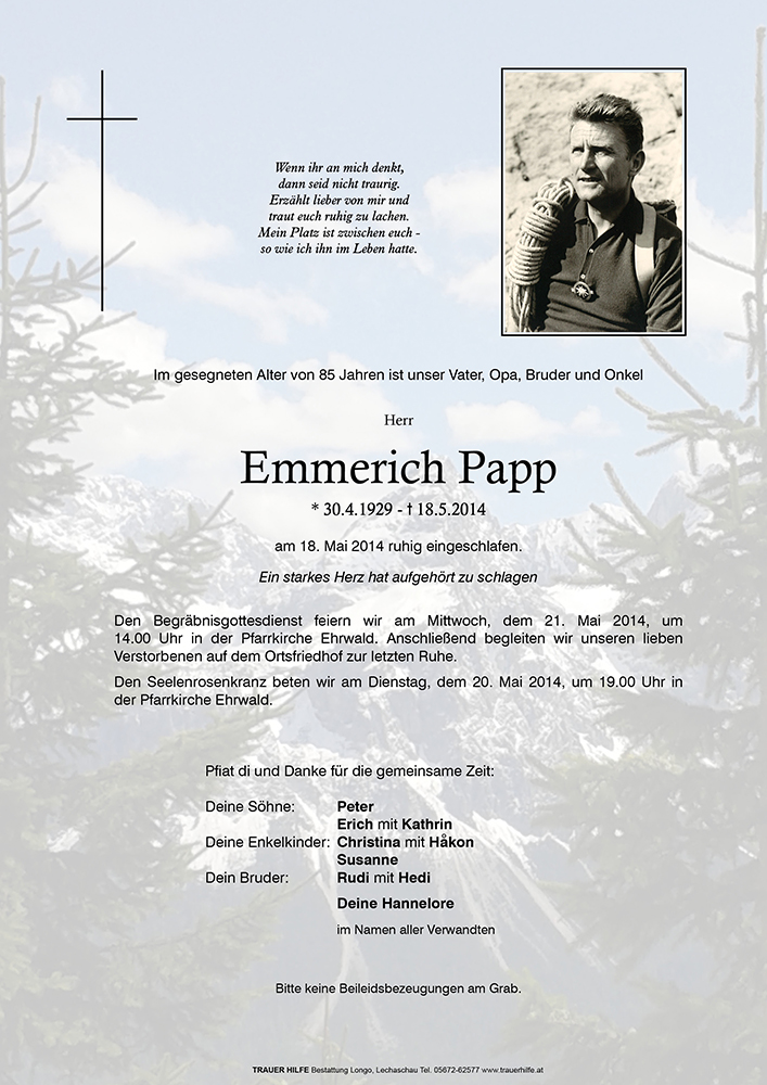 Vielleicht bedeutet Liebe auch lernen, jemanden gehen zu lassen. Nach langem Leiden ist Emmerich nun zum Herrn heimgegangen. Wir wünschen euch für die kommende schwere Zeit viel Kraft und Stärke. Wir trauern mit euch Gerlinde und Hansi