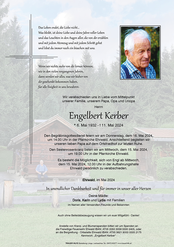 Die Menschen, die von uns gehen und die wir lieben, verschwinden nicht. Sie sind immer an unserer Seite, ungesehen, ungehört und dennoch immer ganz nah bei uns. Für immer geliebt und für immer vermisst, bleiben sie für immer in unserem Herzen. Wir werden Engelbert in guter Erinnerung behalten