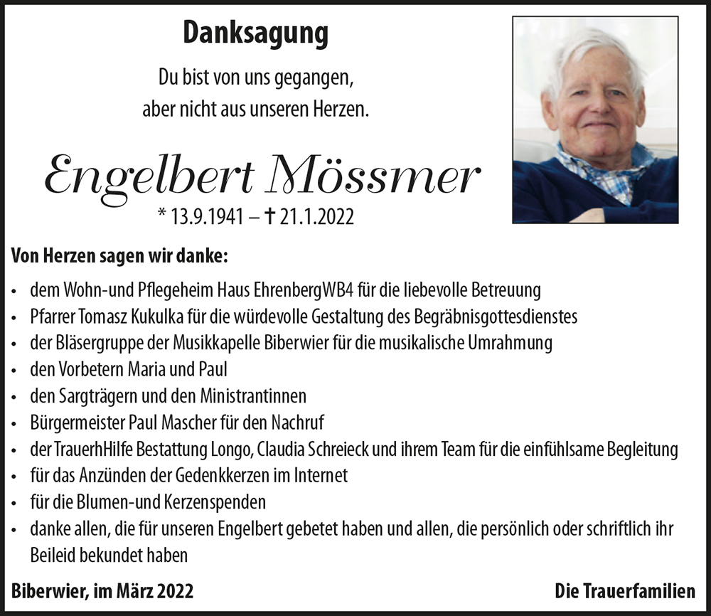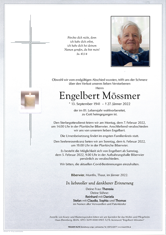 Engelbert hatte ein sehr erfülltes Leben - wesentlich hat er mit seinem Fleiss u seiner Ausdauer das Leben seiner Familie geprägt. Und das Schicksal meinte es mit seiner Krankheit nicht besonders gut. Ich kann mir vorstellen, dass es Engelbert nicht leicht gefallen ist, seinen Lebensabend im Pflegeheim zu verbringen. Doch der Herrgott wollte es so. Deshalb will ich Engelbert heute ein besonderes Danke sagen für die vielen Arbeitsstunden für die Gemeinde.