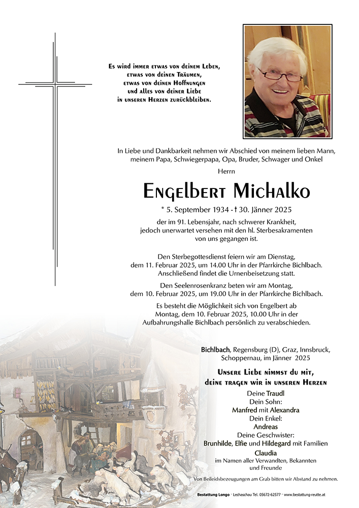 Engelbert war als „Krippeler“ der Krippenfreunde Bichlbach maßgeblich am Bau der „Zunftkrippe“ 2018 beteiligt. Laufend wurde die Zunftkrippe mit Figuren aus Engelberts „Schnitzerhand“ erweitert. In dankbarer Erinnerung bleibt die Zunftkrippe immer ein besonderer Teil von Engelbert. Engelbert war ein langjähriges, treues Mitglied der Handwerks/-Zunftbruderschaft St. Josef zu Bichlbach. Unvergessen bleiben auch die zahlreichen Begegnungen und humorvollen Gespräche. Wir werden Engelbert in bester Erinnerung behalten und ihm ein ehrendes Andenken bewahren.