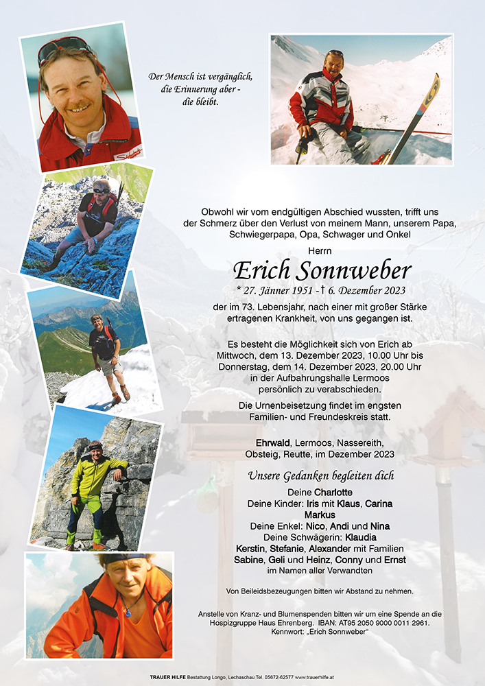 Mit großer Betroffenheit möchte ich euch und euren Lieben mein aufrichtiges Beileid entbieten. Viel zu früh musste Erich seine Augen für immer schließen, was bleibt sind die Erinnerungen. Mögen all eure schönen Erinnerungen euch in der schweren Zeit der Trauer und des Loslassens Kraft und Trost spenden. Mein Papa hat euren Erich als langjährigen Skilehrer auf jeden Fall über alles geschätzt.
