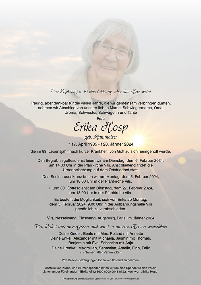 Leb\' wohl Erika! Danke, dass wir Dich auf Deinem Weg begleiten durften. Du wirst mit Freude und Liebe von Gottes Armen empfangen werden.