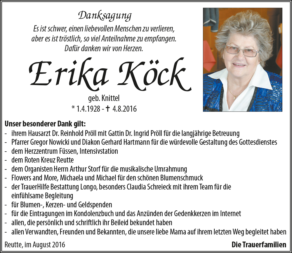 Unser Mitgefühl dürfen wir den Trauerfamilien ausdrücken. Erika war mehr als nur eine gute Bekannte von uns. Wir trauern mit.