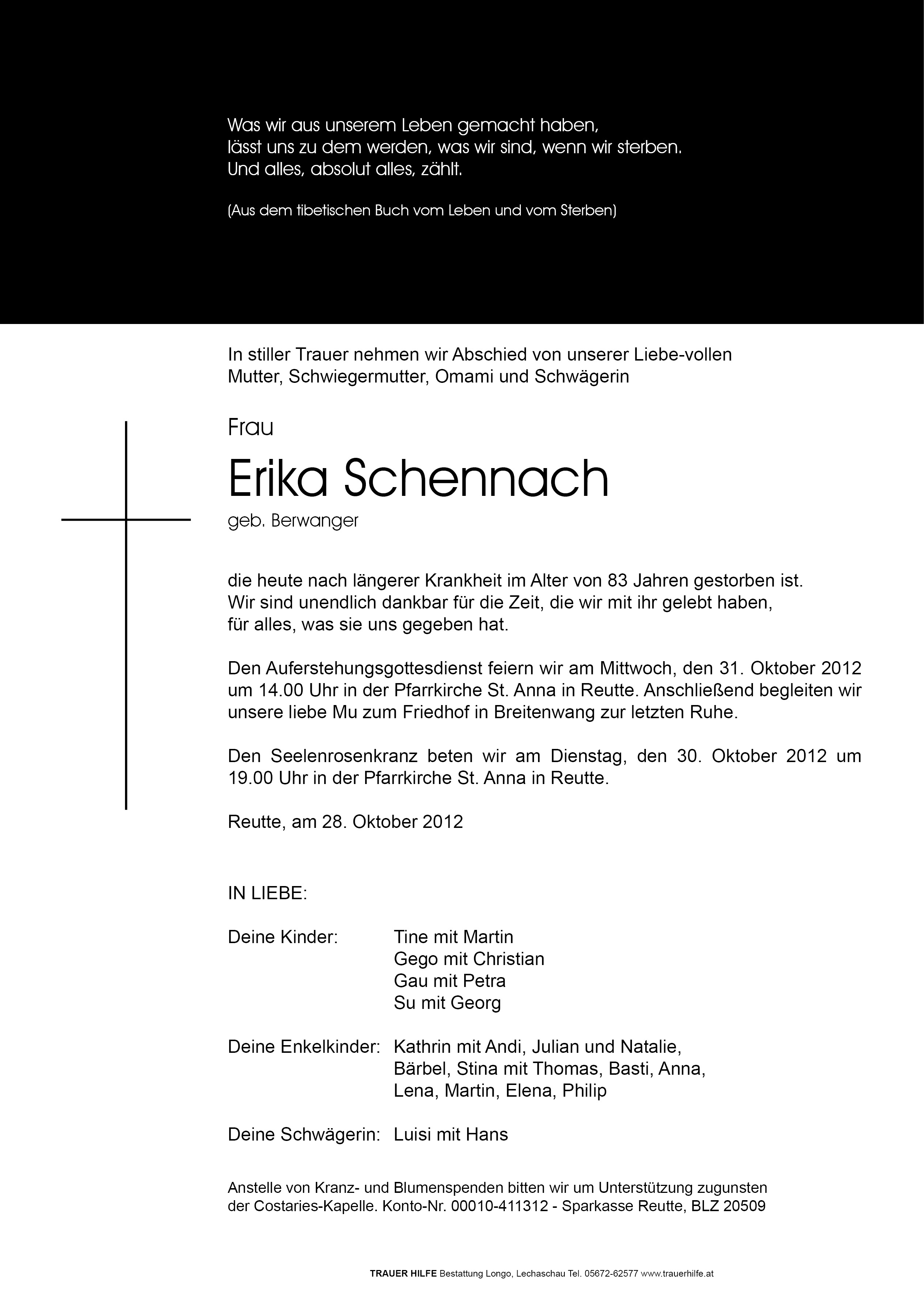 Wir fühlen mit Euch, werte Familien. Erika war uns immer eine gute Freundin, deren es heute nicht mehr viele gibt.