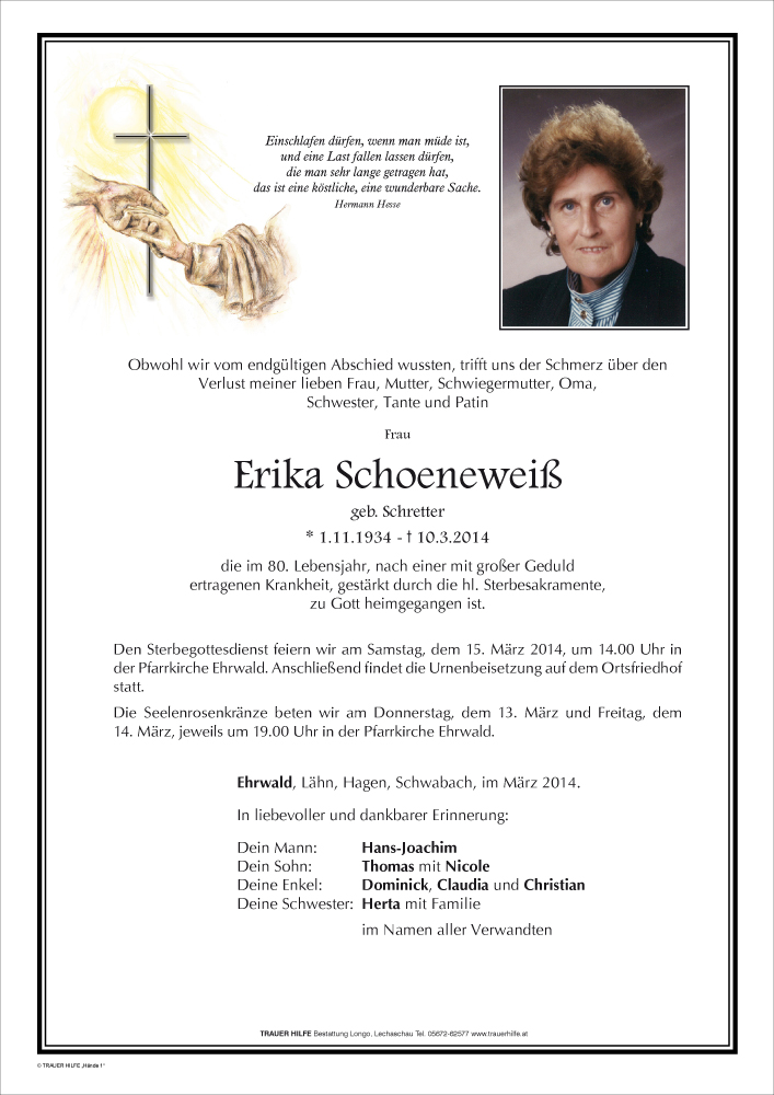 lieber jochen lieber thomas mit familie.zum tode erikas moechten wir euch unser aufrichtiges beileid ausdruecken.wir fuehlen mit euch.christl mit familie.
