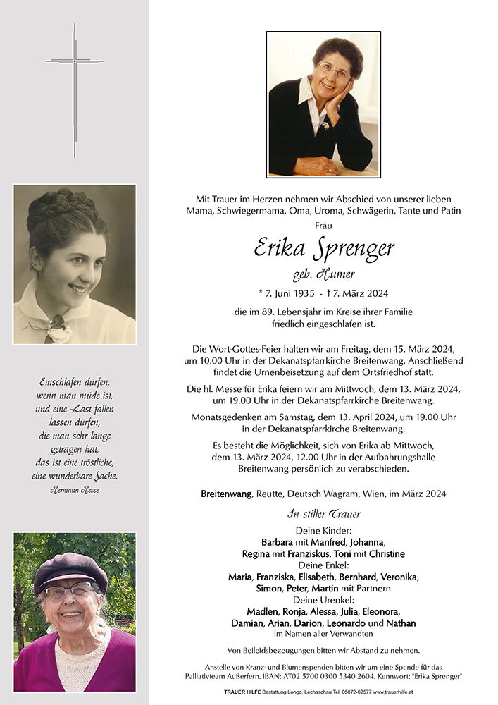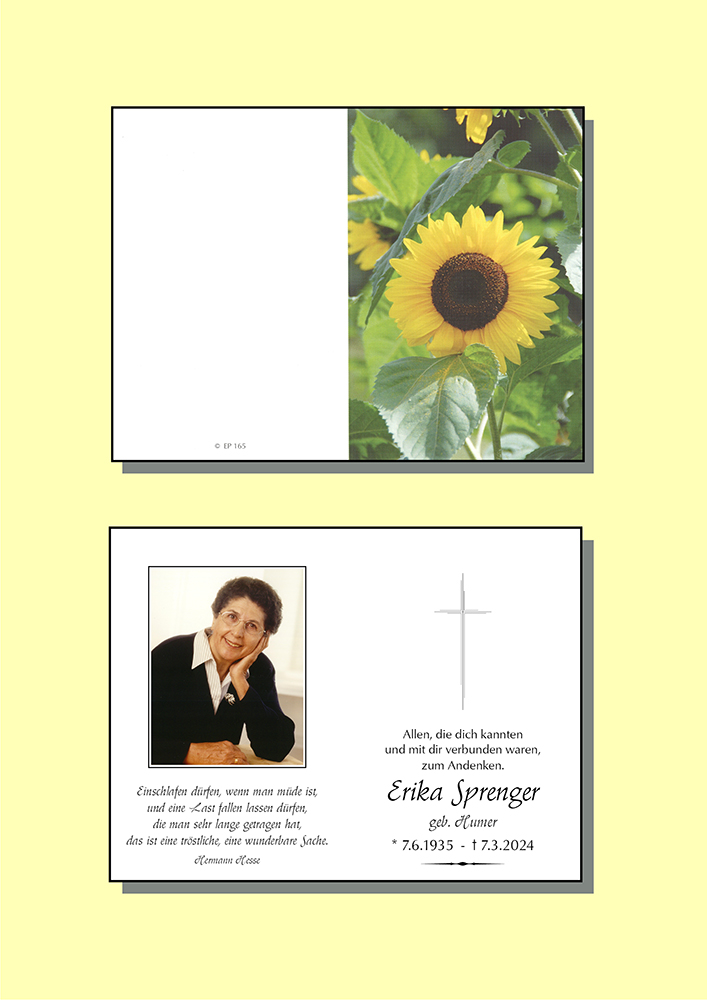 Mit dem Verlust eines geliebten Menschen verliert man sehr, sehr viel, aber niemals die schönen Erinnerungen an die gemeinsam verbrachte Zeit! In unseren Herzen tragen wir Erika weiter! Sie war ein sehr fröhlicher Mensch, für uns oft ein „Sonnenschein“ … und das trotz vieler schwerer Schicksalschläge, die sie in ihrem Leben und vor allem in der Kriegszeit und Nachkriegszeit miterleben musste!