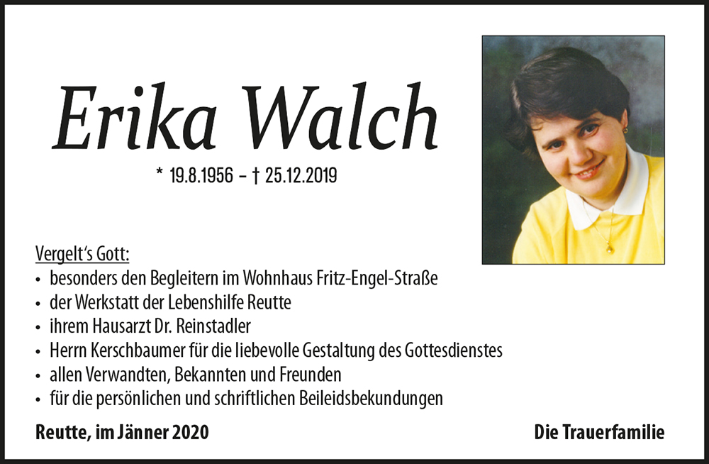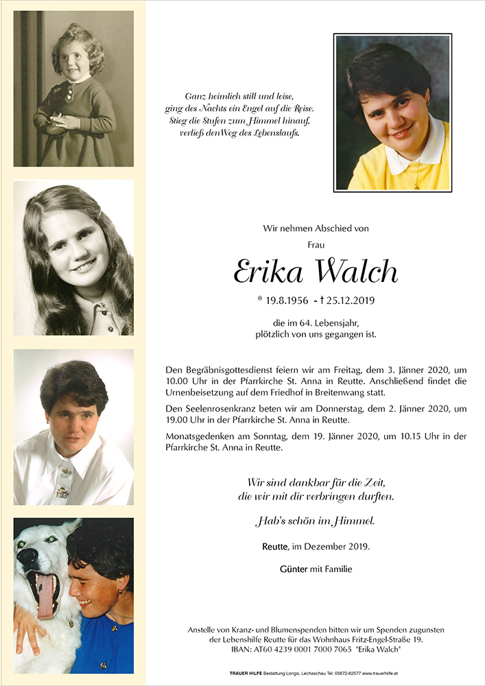 in tiefer Betroffenheit haben wir vom plötzlichen Ableben unserer Klientin Erika Walch erfahren.