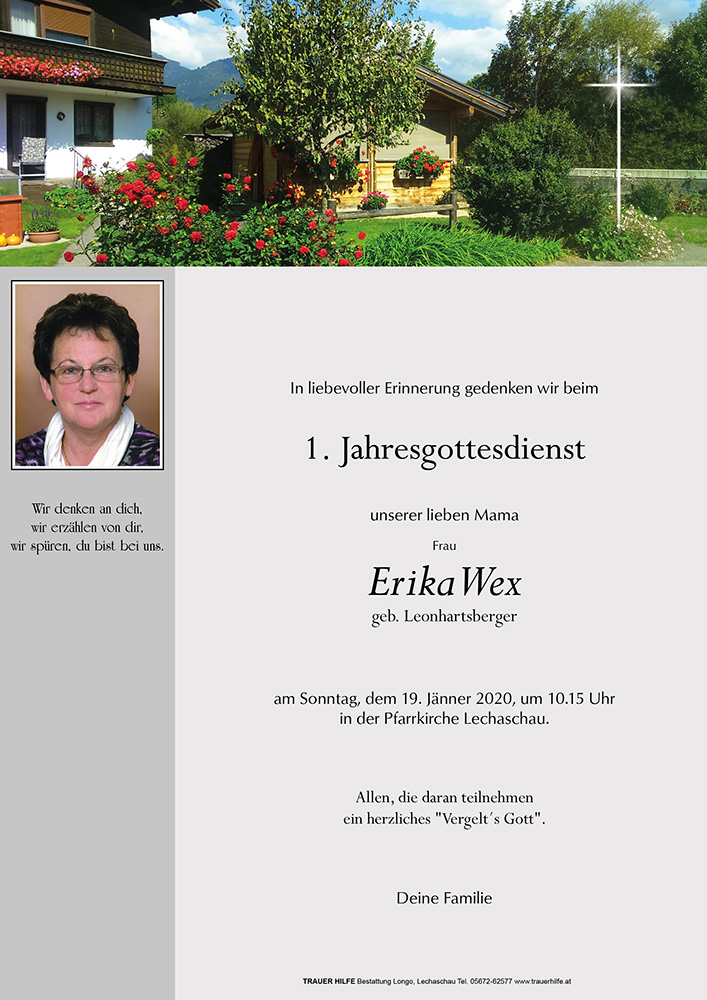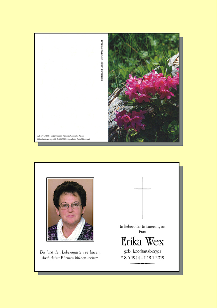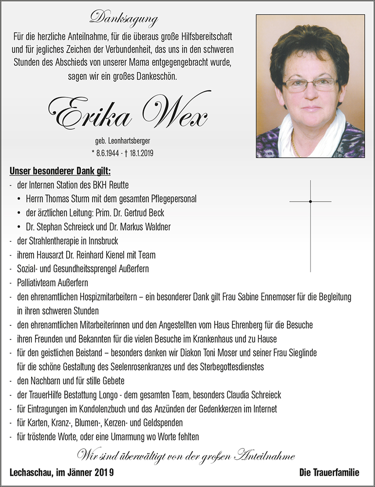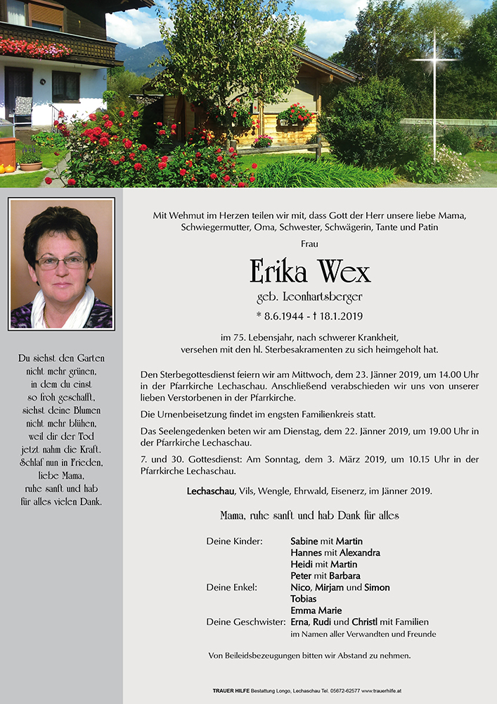 Wir haben Frau Erika Wex vor einigen Wochen als Zimmernachbarin unserer Mama und Oma kennengelernt, die wir leider ebenfalls kürzlich verloren. Die letzten Wochen sprachen wir sehr oft von ihr, sie ist uns sehr eindrücklich in Erinnerung geblieben. Durch ihre freundliche offene Art sind wie gleich ins Gespräch gekommen, trotz ihrer schweren Krankheit und damit verbundenen Beschwerden, vermittelte sie uns Stärke und Zuversicht. Liebevoll und fürsorglich warf sie ein Auge auf unsere Mutter, wofür wir ihr sehr dankbar sind.