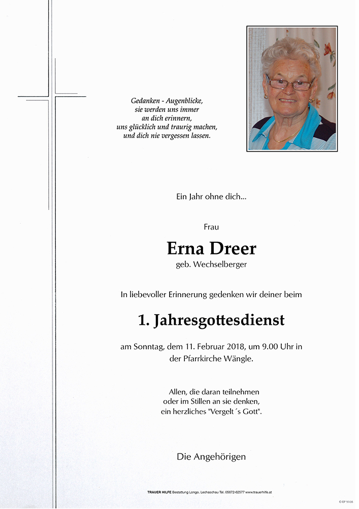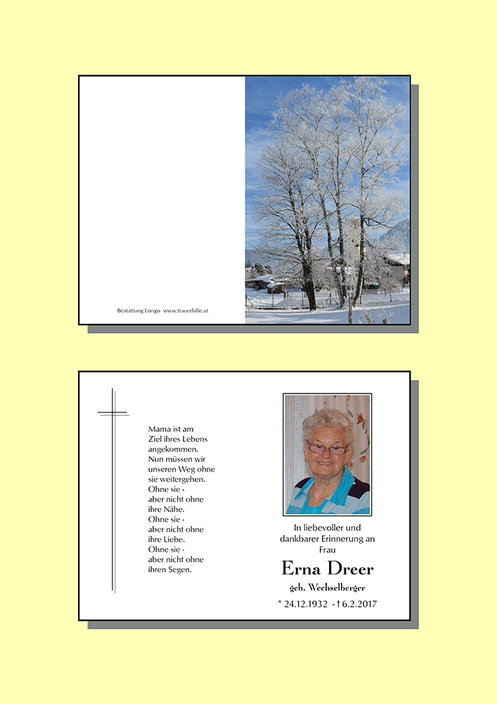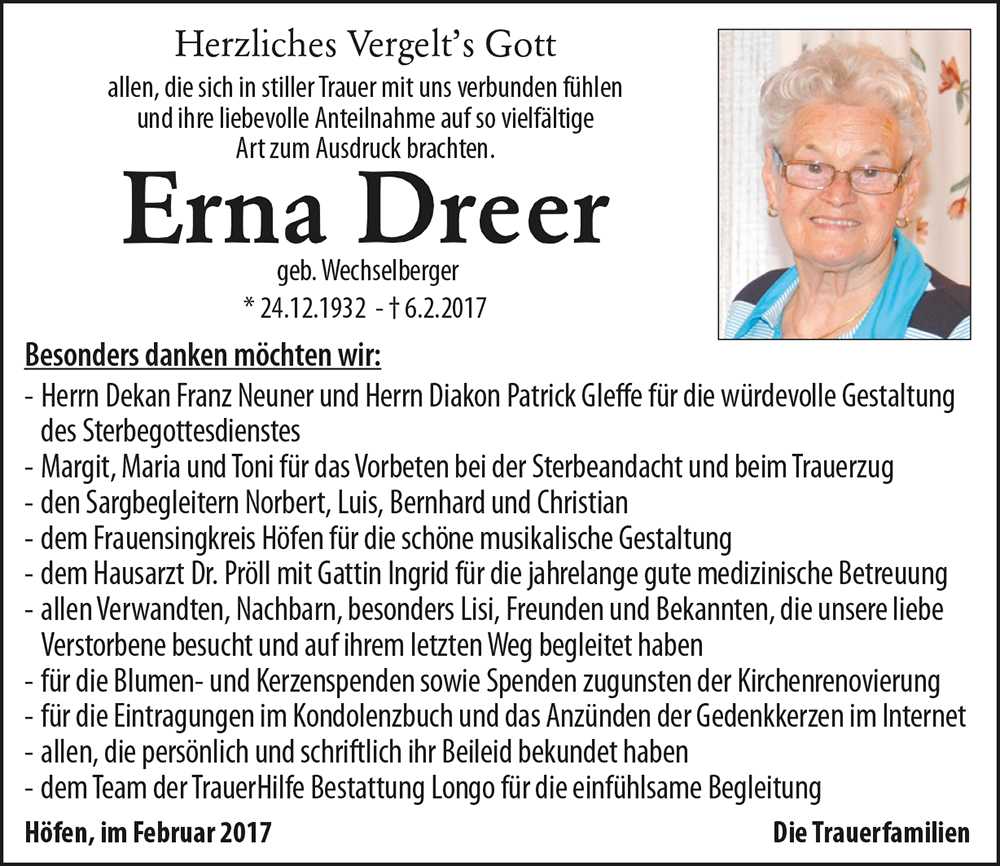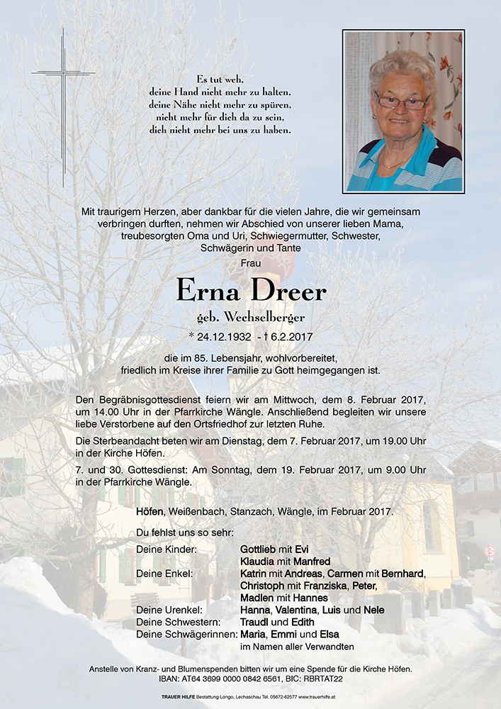 wir sind nur Gast auf Erden und wandern ohne Ruh mit vielerlei Beschwerden der ewigen Heimat zu. Die vielen Beschwerden hat Eure liebe Erna nun überstanden, das seelige Leben hat sie sich verdient. Für Euch Angehörige ist das nur ein kleiner Trost. Ihr habt alles menschenmögliche für Eure Mutter getan, dies sollte Euch ein großer Trost sein.