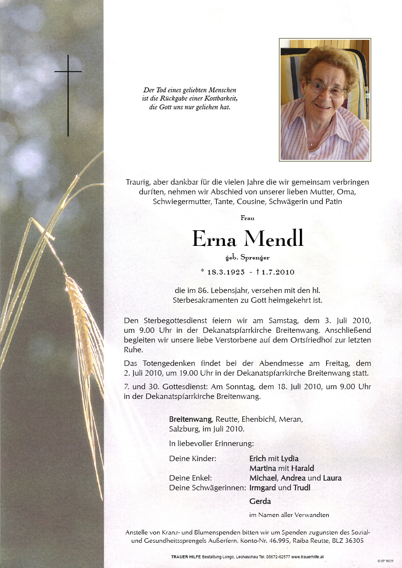 13.12.1901 01.07.2010 Breitenwang Erna Mendl Action Parte Sterbebild Gedenkkerzen Kondolenzen Danksagung Parte Sterbebild Gedenkkerzen Kondolenzen Danksagung Parte herunterladen Sterbebild herunterladen Gedenkkerzen für Erna Mendl 1 Eintrag Kerze anzünden stille anteilnahme c. steiger Ihre Gedenkkerze fürErna Mendl Ihr Name* Farbe auswählen Ihre Nachricht oder Name* E-Mail-Adresse* Mit dem Klicken auf "Kerze anzünden" erklären Sie sich mit unseren Datenschutzbestimmungen einverstanden. Kondolenzbuch für Erna Mendl 0 Einträge Kondolenz verfassen Ihr Abschiedsgruß an Erna Mendl Ihr Name* E-Mail-Adresse* Ihre Nachricht* Mit dem Klicken auf "Gruß absenden" erklären Sie sich mit unseren Datenschutzbestimmungen einverstanden. Danksagung herunterladen