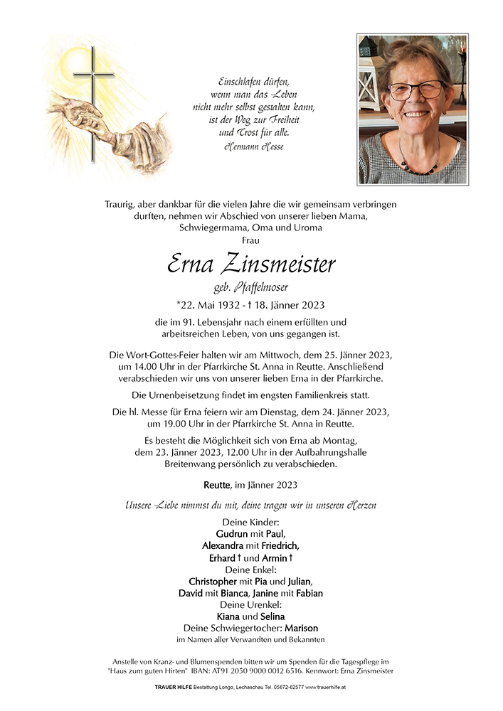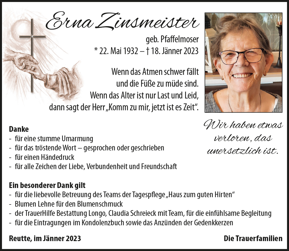 Die Mutter war´s , was braucht´s der Worte mehr. Ich möchte euch auf diesem Wege mein aufrichtiges Beileid entbieten. Ich werde Frau Zinsmeister, eure gute Mutter, stets in Erinnerung behalten. Ich habe sie schon als Kind kennengelernt und immer als fleißige und nette Frau gesehen. Arbeit war ihr Leben. Nun hat sie ihre ewige Ruhe.