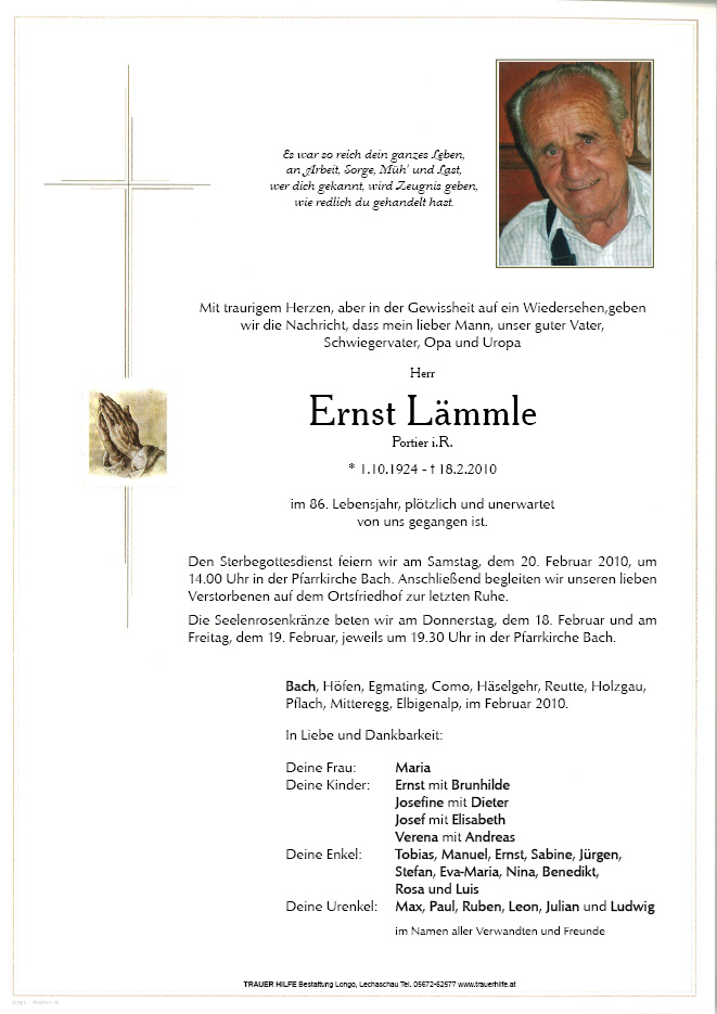 13.12.1901 18.02.2010 Bach Ernst Lämmle Action Parte Sterbebild Gedenkkerzen Kondolenzen Parte Sterbebild Gedenkkerzen Kondolenzen Parte herunterladen Sterbebild herunterladen Gedenkkerzen für Ernst Lämmle 1 Eintrag Kerze anzünden . . . habs fein im Himmel ! Ihre Gedenkkerze fürErnst Lämmle Ihr Name* Farbe auswählen Ihre Nachricht oder Name* E-Mail-Adresse* Mit dem Klicken auf "Kerze anzünden" erklären Sie sich mit unseren Datenschutzbestimmungen einverstanden. Kondolenzbuch für Ernst Lämmle 0 Einträge Kondolenz verfassen Ihr Abschiedsgruß an Ernst Lämmle Ihr Name* E-Mail-Adresse* Ihre Nachricht* Mit dem Klicken auf "Gruß absenden" erklären Sie sich mit unseren Datenschutzbestimmungen einverstanden.