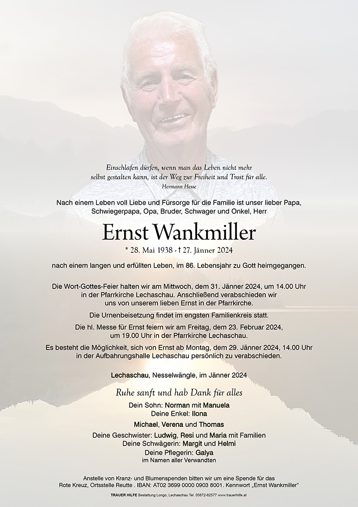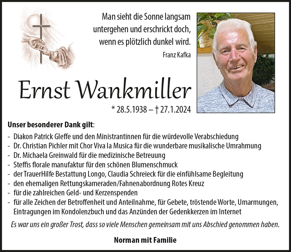 Mit dem Verlust eines geliebten Menschen verliert man viel, aber niemals die schönen Erinnerungen an die gemeinsam verbrachte Zeit! In unseren Herzen tragen wir Ernst weiter!