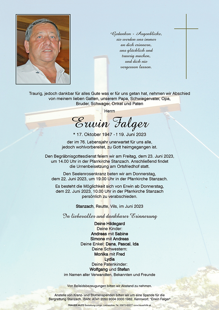 Trauert gemeinsam und erinnert euch an die schönsten Stunden in denen ihr mit Erwin zusammen ward, denn in eurer Erinnerungen bleibt euer Erwin verbunden.