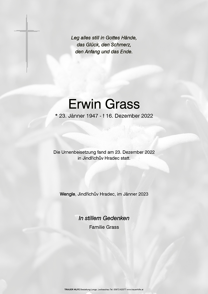 23.01.1947 16.01.2023 Wengle Erwin Grass Action Parte Gedenkkerzen Kondolenzen Parte Gedenkkerzen Kondolenzen Parte herunterladen Gedenkkerzen für Erwin Grass 51 Einträge Kerze anzünden Ruhe in Frieden Günther Fam. Joe & Babsi Vögele Heini & Petra Ruhe in Frieden Juli Schennach mit Claudia , Klaus und Bruno Renate und Waltraud Hubert & Marianne Ruth u. Berthold mit Fam. Wolfgang Eberle Ursula und Roman Heim, Pinswang Fam.Adolf Schönherr,Biberwier Komm gut Heim ⚘? Fam. Gerhard Wechner Fam. Alexandra u. Hannes Wex Willi und Marlene Sprenger Bichlbach Wolfgang und Anni Thaler Brigitte Kätzler Fam. Joe & Babsi Vögele Ein Licht für dich Marlene und Sepp Lutz Im stillen Gedenken Fam. Harald und Christl Hosp A Liachtl für deine Reise Fam. Nagele Michaela & Gerhard Schwarz Theo und Renate Paul&Adele Strolz Michael und Gitti Reinhold und Resi Herbert und Evi Paul Rimml Alfred Sonnweber Edi Ammann Herbert Floh Heini & Petra Bernhard Zaggl Fam.Hermann Eiter Fam. Franz Hartmann Bernadette & Herbert Krammer A Liachtl für di Hannelore & Toni Lutz Thomas Hosp Familie Anton Specht Fam. Rosa Koch Dein Sohn Günther Ruhe in Frieden Edeltraud Irmgard mit Familie Claudia Schreieck TrauerHilfe Bestattung Longo Ihre Gedenkkerze fürErwin Grass Ihr Name* Farbe auswählen Ihre Nachricht oder Name* E-Mail-Adresse* Mit dem Klicken auf "Kerze anzünden" erklären Sie sich mit unseren Datenschutzbestimmungen einverstanden. Kondolenzbuch für Erwin Grass 1 Eintrag Kondolenz verfassen Guter Vater, hab lieben Dank für Alles und Ruhe in Frieden. Dein Sohn Günther 21.01.2023 um 19:54 Uhr Ihr Abschiedsgruß an Erwin Grass Ihr Name* E-Mail-Adresse* Ihre Nachricht* Mit dem Klicken auf "Gruß absenden" erklären Sie sich mit unseren Datenschutzbestimmungen einverstanden.