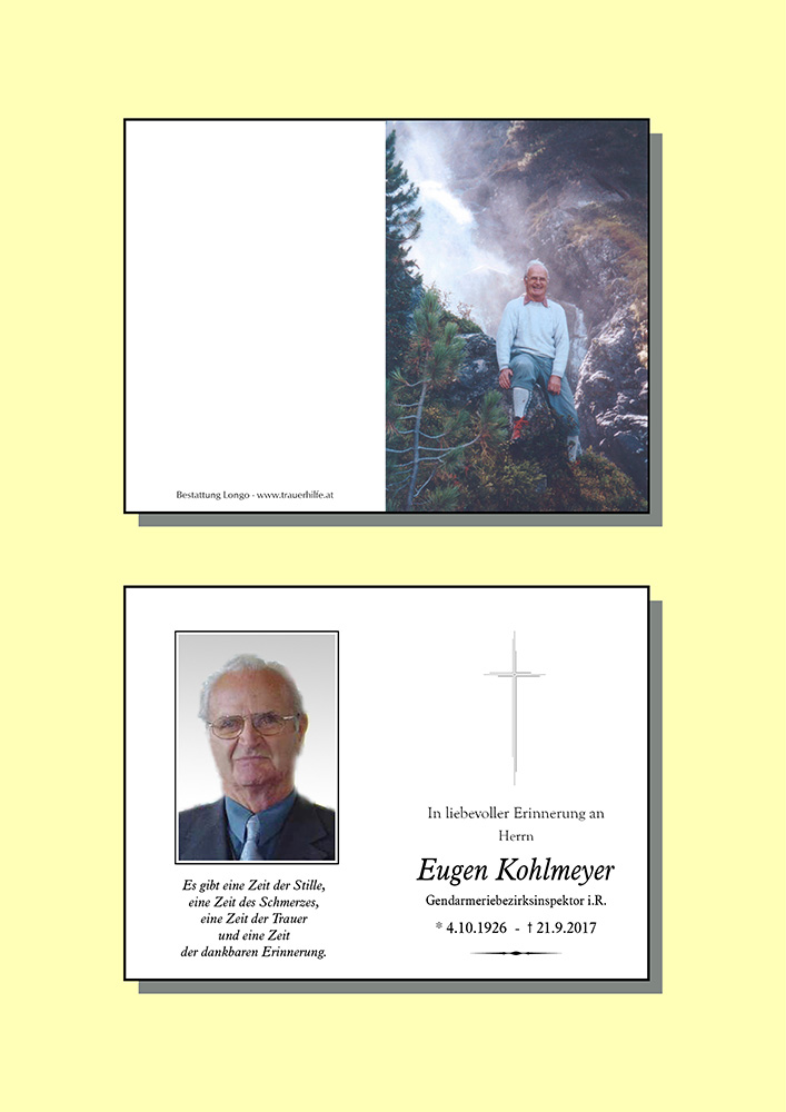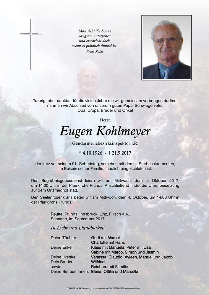 Vor knapp einem Jahr, bei unserem alljährlichen Kronburgtreffen, hätten wir nicht gedacht, dass beim nächsten Mal zwei Plätze aus unserer Familie für immer frei bleiben. Die schönen Gespräche mit dir, Erinnerungen an alte Zeiten und Erlebnisse im Alpinismus und Gendarmeriedienst werden uns sehr fehlen. Lieber Eugen, dennoch bleibst du für uns ein unvergesslicher Teil unseres eigenen Lebens. Wir halten dir ein ehrendes Andenken, ruhe in Frieden!