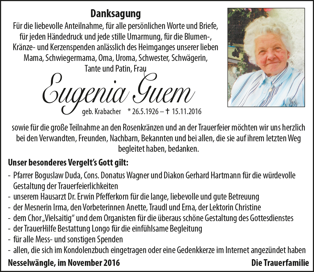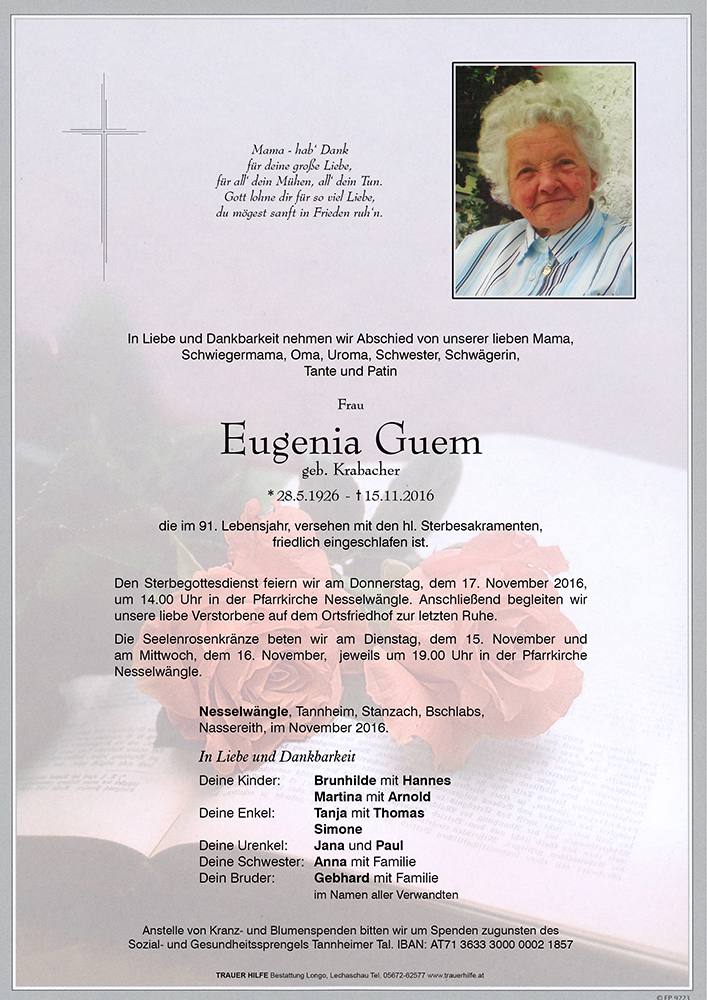 Liebe Martina, liebe Brunhilde!Aufrichtiges Beileid und viel Kraft für diese schwere Zeit ! Auch ich werde Tante Geni in lieber Erinnerung behalten!