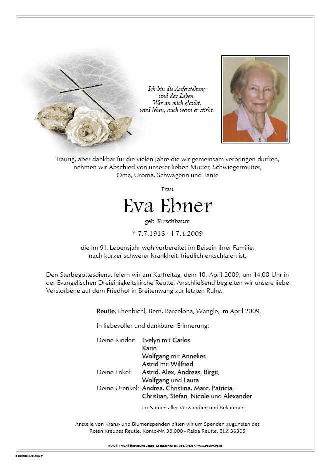 13.12.1901 07.04.2009 Reutte Eva Ebner Action Parte Gedenkkerzen Kondolenzen Parte Gedenkkerzen Kondolenzen Parte herunterladen Gedenkkerzen für Eva Ebner 2 Einträge Kerze anzünden Astrid, Laura & Wilfried Astrid, Laura und Wilfried Ihre Gedenkkerze fürEva Ebner Ihr Name* Farbe auswählen Ihre Nachricht oder Name* E-Mail-Adresse* Mit dem Klicken auf "Kerze anzünden" erklären Sie sich mit unseren Datenschutzbestimmungen einverstanden. Kondolenzbuch für Eva Ebner 0 Einträge Kondolenz verfassen Ihr Abschiedsgruß an Eva Ebner Ihr Name* E-Mail-Adresse* Ihre Nachricht* Mit dem Klicken auf "Gruß absenden" erklären Sie sich mit unseren Datenschutzbestimmungen einverstanden.