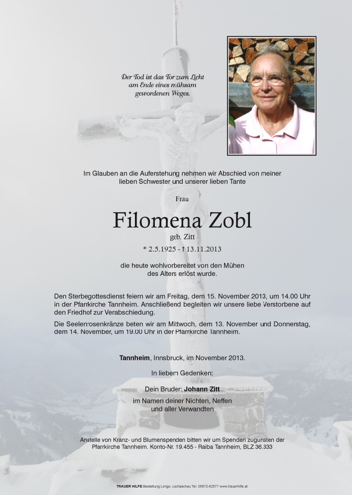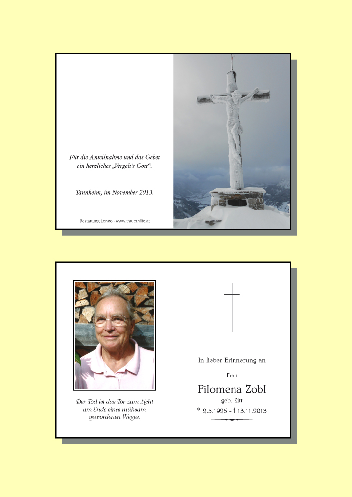 02.05.1925 13.11.2013 Tannheim Filomena Zobl Action Parte Sterbebild Gedenkkerzen Kondolenzen Parte Sterbebild Gedenkkerzen Kondolenzen Parte herunterladen Sterbebild herunterladen Gedenkkerzen für Filomena Zobl 39 Einträge Kerze anzünden A Liachtle zum Jahrtag SGS Außerfern Fam. Zobl Engelbert Fam. Walter u. Renate Ruepp Sabine Alber mit Familie Ruhe in Frieden Rosa Koch Amman Emma Ruhe in Frieden Siegfried Koch Brigitte u. Othmar Babl Ernst & Ulrike Fam. Herbert und Doris Daurer Fam. Lochbihler Fam. Ennemoser Isabella Karl, Ingrid und Adi Fam Andrea u. Roland Pirschner Sieglinde und Ambros Wötzer ruhe in frieden mena Familie Willi u. Maria Rief Ariane und Mathias Wegmann Cornelia und Alois Lechleitner Rudi Rief Rosmarie und Reinhard Rief Fam. Peintner Siegmund Carla und Theresia Luise und Roswitha Durst Ruhe in Frieden Waibel Elisabeth Familie Reinstadler A. a Liechtle für di. . . . Fam. Ilse Schlux Elbigenalp Reinhold Pichler mit Familie Pfarrgemeinderat Tannheim Elisabeth u. Heinz Walch Erika Masuck Fam. Zotz Tanja u. Bernd ruhe in Frieden Lisl + Maria TrauerHilfe Bestattung Longo Marco u. Petra Ried Ihre Gedenkkerze fürFilomena Zobl Ihr Name* Farbe auswählen Ihre Nachricht oder Name* E-Mail-Adresse* Mit dem Klicken auf "Kerze anzünden" erklären Sie sich mit unseren Datenschutzbestimmungen einverstanden. Kondolenzbuch für Filomena Zobl 0 Einträge Kondolenz verfassen Ihr Abschiedsgruß an Filomena Zobl Ihr Name* E-Mail-Adresse* Ihre Nachricht* Mit dem Klicken auf "Gruß absenden" erklären Sie sich mit unseren Datenschutzbestimmungen einverstanden.