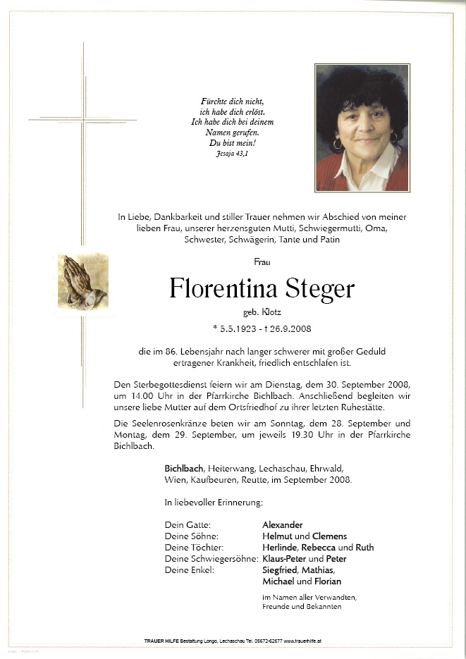 13.12.1901 26.09.2008 Bichlbach Florentina Steger Action Parte Gedenkkerzen Kondolenzen Parte Gedenkkerzen Kondolenzen Parte herunterladen Gedenkkerzen für Florentina Steger 0 Einträge Kerze anzünden Ihre Gedenkkerze fürFlorentina Steger Ihr Name* Farbe auswählen Ihre Nachricht oder Name* E-Mail-Adresse* Mit dem Klicken auf "Kerze anzünden" erklären Sie sich mit unseren Datenschutzbestimmungen einverstanden. Kondolenzbuch für Florentina Steger 0 Einträge Kondolenz verfassen Ihr Abschiedsgruß an Florentina Steger Ihr Name* E-Mail-Adresse* Ihre Nachricht* Mit dem Klicken auf "Gruß absenden" erklären Sie sich mit unseren Datenschutzbestimmungen einverstanden.