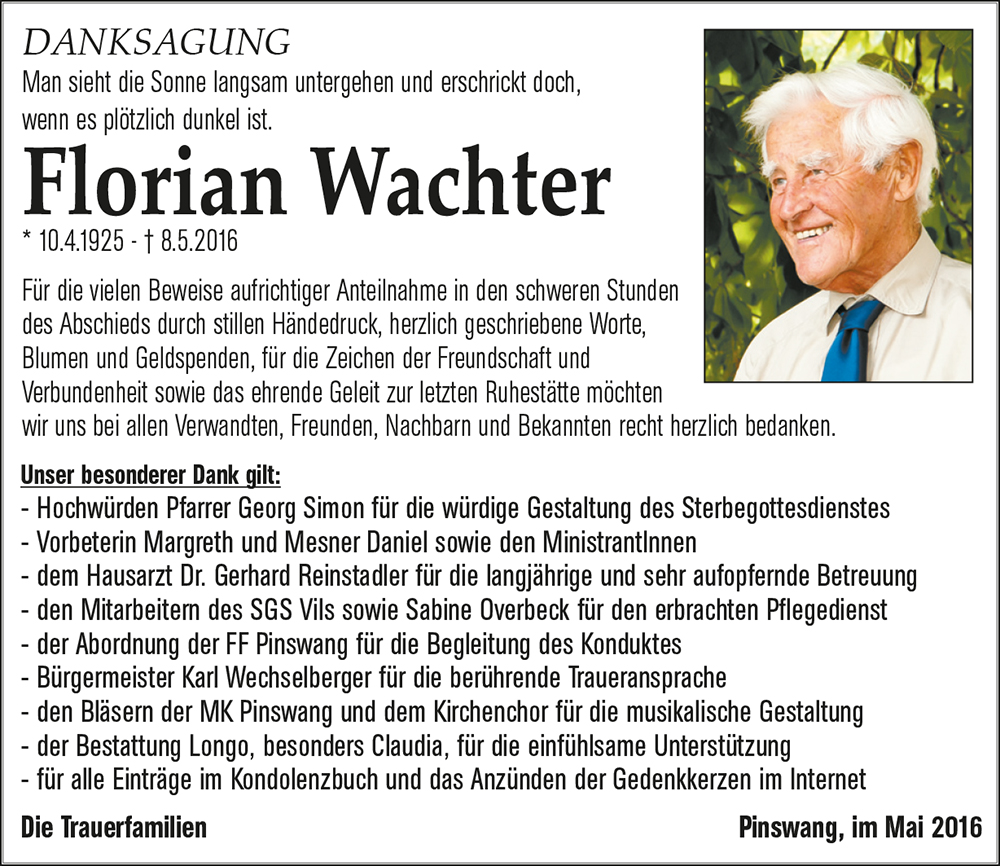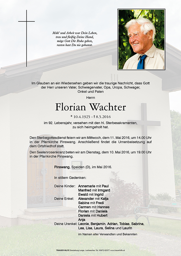 Müde geworden von einem langen, arbeitsreichen Leben, hat Florl seine Augen für immer geschlossen und sich auf seinen letzten Weg gemacht. Möge er ein schönes Plätzchen finden, wo er vereint mit seiner Rosa das ewige Leben genießen kann.