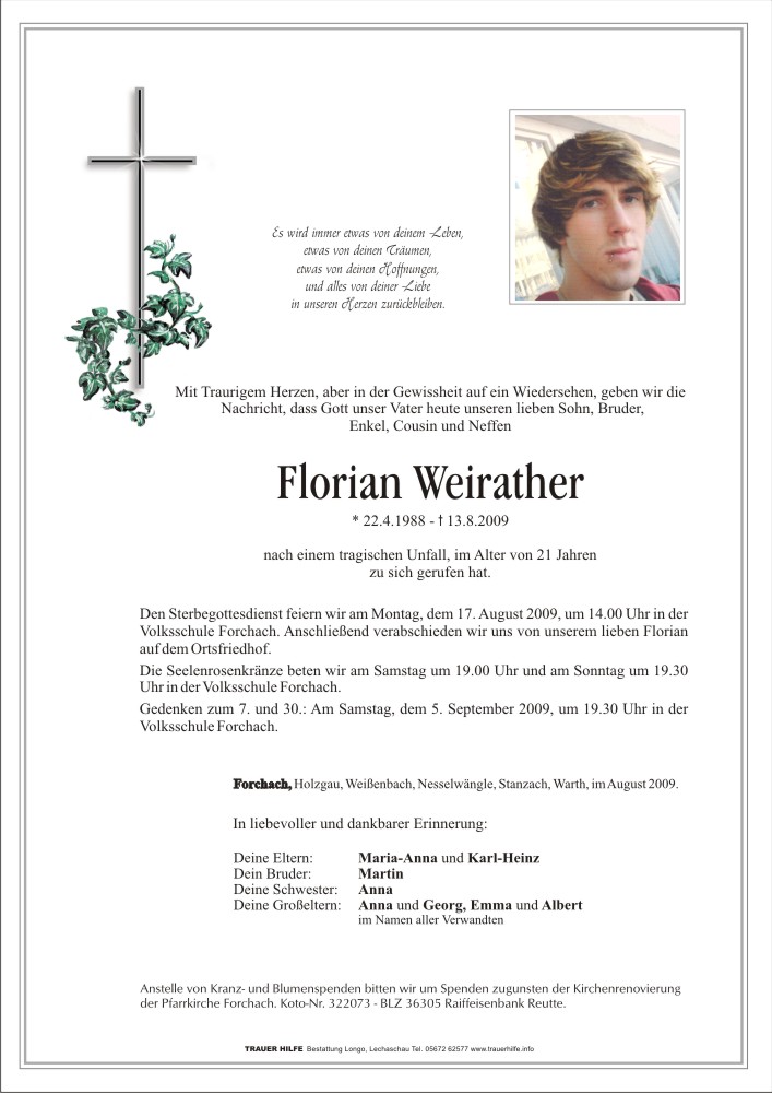 13.12.1901 13.08.2009 Forchach Florian Weirather Action Parte Gedenkkerzen Kondolenzen Parte Gedenkkerzen Kondolenzen Parte herunterladen Gedenkkerzen für Florian Weirather 51 Einträge Kerze anzünden Du fehlst ? Angela I denk an di A Liachtl für di und deine Lieben! A Johrtogskerzle aus Mühl?️ A Johrtogsliachtle Für di und dei Mama Marika Heidi Für die und deir Mama Du fehlst . . . habs fein im Himmel ! Für di, dei Mama und Romina für dich und deine Mama Thomas und Kilian Witting Moosburgger Patrick In lieber Erinnerung Denk an di! Katie Amoi seg ma uns wieder. . . ƒlø ƒø®e√e® Denk an dich A Liachtl für di Ruhe in Friede Danke Das ewige Licht leuchte dir Sonja Ein Licht für dich Denk an dich! mazi Ein Licht für dich Ruhe in Frieden Danke ❤ für alle, denen du fehlst Angela Ich denk an dich, alter Freund ich denke an dich Vermissen dich für dich flori für Dich Florian ein Licht für Florian Wir werden dich nie vergessen! Für dich u. deine Familie. . . In lovely memories Immer in meinen herzen Ruhe sanft in Gottes Hand Ruhe sanft in Gottes Hand in stillem Gedenken Danke für deine lieben Worte in stillem Gedenken Ruhe sanft in Gottes Hand. Du fehlst Bruno + Ingrid Posch Wbch. Ihre Gedenkkerze fürFlorian Weirather Ihr Name* Farbe auswählen Ihre Nachricht oder Name* E-Mail-Adresse* Mit dem Klicken auf "Kerze anzünden" erklären Sie sich mit unseren Datenschutzbestimmungen einverstanden. Kondolenzbuch für Florian Weirather 0 Einträge Kondolenz verfassen Ihr Abschiedsgruß an Florian Weirather Ihr Name* E-Mail-Adresse* Ihre Nachricht* Mit dem Klicken auf "Gruß absenden" erklären Sie sich mit unseren Datenschutzbestimmungen einverstanden.