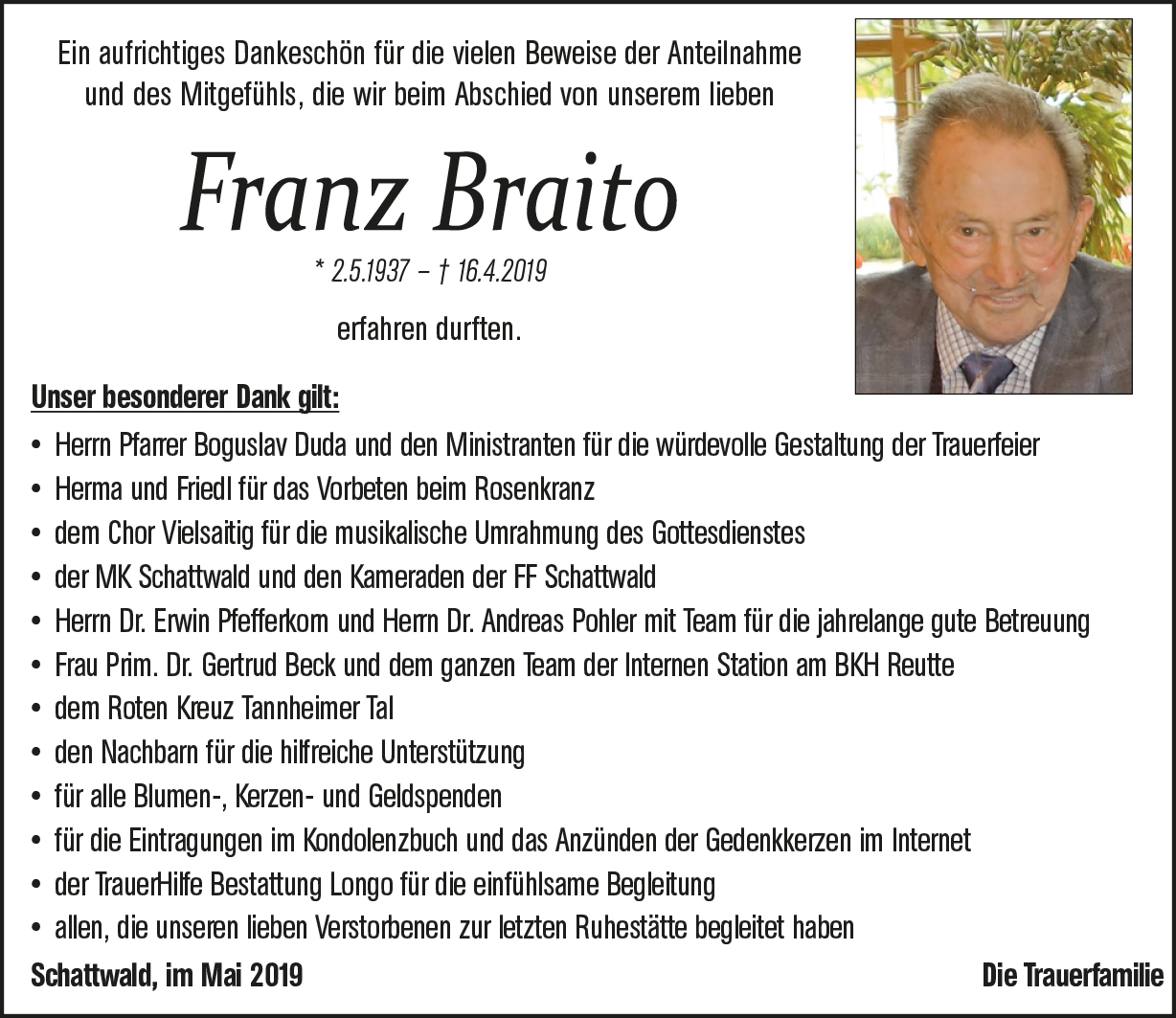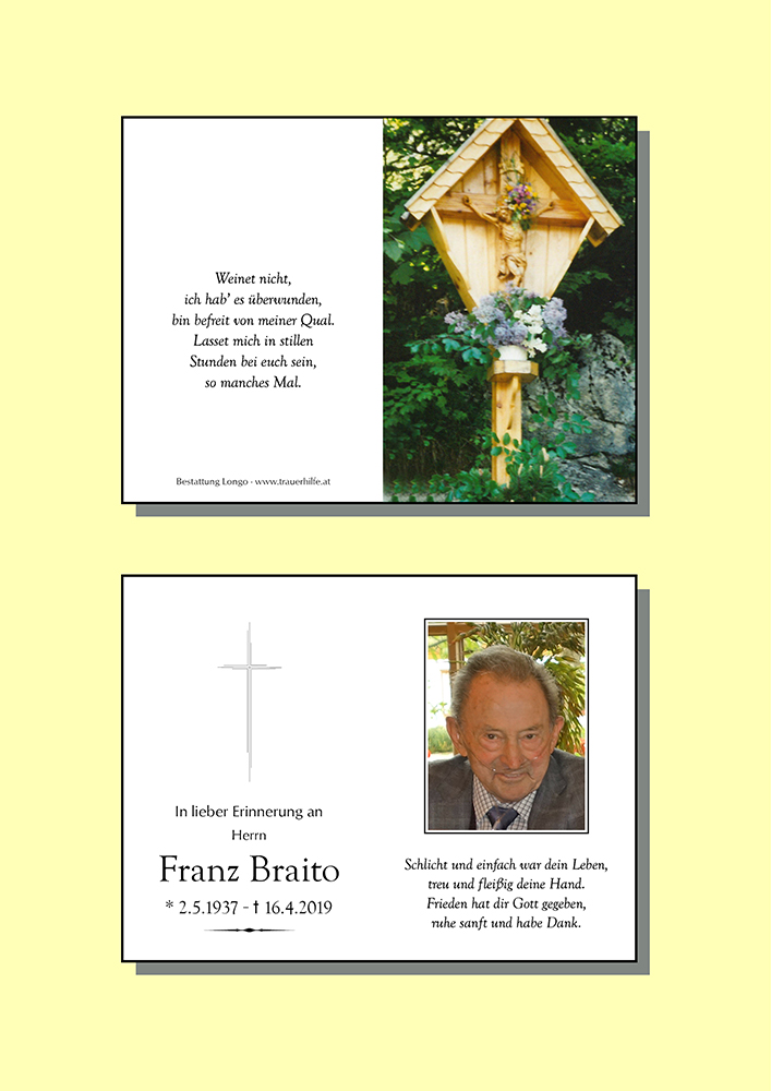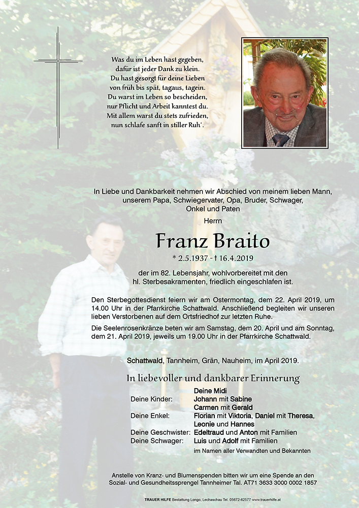 02.05.1937 16.04.2019 Schattwald Franz Braito Action Parte Sterbebild Gedenkkerzen Kondolenzen Danksagung Parte Sterbebild Gedenkkerzen Kondolenzen Danksagung Parte herunterladen Sterbebild herunterladen Gedenkkerzen für Franz Braito 192 Einträge Kerze anzünden Marlen, Dietmar & Fabio Carmen & Gerald Im Herzen bleibst du für immer Carmen, Gerald, Florian und Daniel Marlen, Dietmar & Fabio Marlen, Dietmar & Fabio Hans & Elisabeth Praschberger Marlen, Dietmar & Fabio Hans & Elisabeth Praschberger Fam. Günter&Gitti Muglach Valeria Schöll Wolfgang Stecher mit Familie Marlen, Dietmar & Fabio Fam. Peter & Marianne Schautzgy ursula und peter aus der schweiz Josef Herzog mit Gabi Doris und Christian& Marina Elfi u. Franz Grän Marlies & Elisabeth Fam. Kozjak Zöblen Sandro und Fabio Simone und Gebi Valeria Schöll Fam. Walter Alber RiP Steffi & Kassian Danke Opa für alles Florian & Daniel A Liechtle für Opa - Leonie&Hannes Gottfried Schratz Mathilde und Josef Schratz Patrick & Sabrina Fiegenschuh mit Emma und Ma Luisa und Roswitha Familienverband Schattwald Familie Moosbrugger-Höfen Fam. Schöll Andreas Fam. Christoph Tannheimer Beatrice mit René Moni und Elmar m. Familie Victoria & Flo mit Sarah Marco & Petra Ried Senioren Tannheim-Schattwald-Zöblen Raphaela&Martin Schweißgut Christian&Anita Greger Familie Schnöller Stecher Hermi Birgit und Christian mit Familie Hanne und Heinz und Alex Moll Barbara u. Hansjörg Stotter Ernst u. Ulrike Herbert und Marion Notburga u. Franz Perle Patricia und Walter mit Kinder Fritz Bubendorfer Schautzgy christian Anni & Franz Rief mit Familie Linde Schatz Marion Scheucher Andreas&Kathrin Lechner Wolfgang Stecher mit Familie Petra & Martin Gehring mit Kindern Edmunda Hosp In stillen Gedanken, Luise und Happy In stillen Gedanken, Matthias und Maritta Maria Hermann & Birgit Rief Maria Rief mit Familie Fam. Werner u. Roland Gehring Blg. Walter &Margret Burkert Miriam Ruepp mit Familie Paul und Friederike Barbist Birgit, Manfred, Madlen Stecher Doris u. Gebhard Zobl Klaudia u. Benjamin Grad Angelika und Karl Baumgartner Dani und Xandi Angelika Albert und Rosi Luise Knittel Andi und Elisabeth Reinstadler In stillem Gedenken - Monika B. Fam. Dagmar u. Dietmar Haider Eduard u. Magdalena wagner Fam. Robert Schatzlmair eiblhuber@aon. at Richard u. Monika Höfferer Das Team des SGS Außerfern Fam. Engelbert Ostheimer Alfons und Monika Weber mit Familie Thomas und Anni mit Familie Andy und Sara mit Sofia Glätzle Wolfgang u. Birgit A Liachtl für di - Luis Müller Marlene und Paul Michi Hosp Fam Tassenbacher Reutte Claudia & Walter Reinhard aus der Enge Melanie Stecher Fam. Klaus u. Tamara Hornstein Robert und Eve mit Niclas und Jomathan Fam. Helmut u. Christine Kogler Greti Weirather Reinhard Bertlmann Christine Storf Angela und Bernd Kiel Fam. Kurt und Blanka Larcher Fam. Pirschner-Wötzer Fam. Arzl Maria Luise Hildegund Peintner Simone und Niels Fuchs Sabine mit Fam. Doris Schautzgy Petra und Georg mit Josef Xaver Müller Ariane und Mathias Wegmann Kornelia und Alois Lechleitner Rudi und Rosmarie Rief Reinhard Lechleitner Fam. Gomig Josef-Imst Andreas und Katrin Hannes & Brunhilde Barbara u. Mario Rief Belinda Petra und Poldi Verena und Joachim Gerold & Marina mit Lena Heidi Manfred, Silvia und Michael Brunhilde und Oskar Carmen Dirr Theresia und Heinrich Daniela Leuschner Susanna Müller Carla und Hubert Marlen, Dietmar & Fabio Klaus u. Martha Schneider Hebsch, Manu, Anna u. Christoph Daniela, Günther, Maximilian und Johanna Ruhe in Frieden Elke& Gerhard Evelyn und Bernhard Franz und Sabina Reinhilde, Elmar mit Familie A Kerzl aus Innsbruck Friede/Freude werde dir zuteil Fam. Renate und Wallter Ruepp Katrin, Markus und Felix Robert und Maria Tannheimer Resi Bestle Peter Vögele mit Familie Anna & Ingo Renate Rettenwander Marlies und Ingo Vindl Alexandra mit Familie Luis und Agnes Alber Fam. Christian u. Sabine Alber Kurt, Gitti und Lisa Ramona Rief mit Kinder Fam. Doris und Herbert Daurer Ruhe in Frieden Herbert u. Irma mit Familie Gerald&Maria mit Tobias&Hanna Reinhold Pichler mit Familie Dietlinde & Harald mit Familie Norbert & Silke mit Nico Adolf Kerber Florian, Susanne, Verena u. Christiane Martina Müller Fam. Paul und Annemarie Kaiser Thomas Huter Fam. Ruepp Peter Loni u. Nino Stefan, Steffi, Ann-Sophie & Julian Edith & Sepp H&H Felsberger Fam. Gertrud Müller Margit und Norbert Schneider Fam. Dietmar und Karin Rädler Ruhe in Frieden Fridolina und Herbert Birgit Rid m. Familie Hermann u. Sieglinde Zobl Aline Fam. Roland Fiegenschuh Christine & Robert mit Martin und Linda Lenz Maria Fam. Lenz Bernd & Alexandra Kathi Immler Patricia Zotz Tanja Bernd Zotz In guter Erinnerung! Alexandra und Thomas mit Familie Fam. Hedi Zimmer Simone und Frank mit Kinder Claudia Schreieck TrauerHilfe Bestattung Longo Ihre Gedenkkerze fürFranz Braito Ihr Name* Farbe auswählen Ihre Nachricht oder Name* E-Mail-Adresse* Mit dem Klicken auf "Kerze anzünden" erklären Sie sich mit unseren Datenschutzbestimmungen einverstanden. Kondolenzbuch für Franz Braito 1 Eintrag Kondolenz verfassen Ich gehe Euch voraus in den ewigen Frieden des Herrn und erwarte Euch zum ewigen Wiedersehen. Gottes Wille ist geschehen. Familie Lutz Josef und Lucia 21.04.2019 um 20:16 Uhr Ihr Abschiedsgruß an Franz Braito Ihr Name* E-Mail-Adresse* Ihre Nachricht* Mit dem Klicken auf "Gruß absenden" erklären Sie sich mit unseren Datenschutzbestimmungen einverstanden. Danksagung herunterladen
