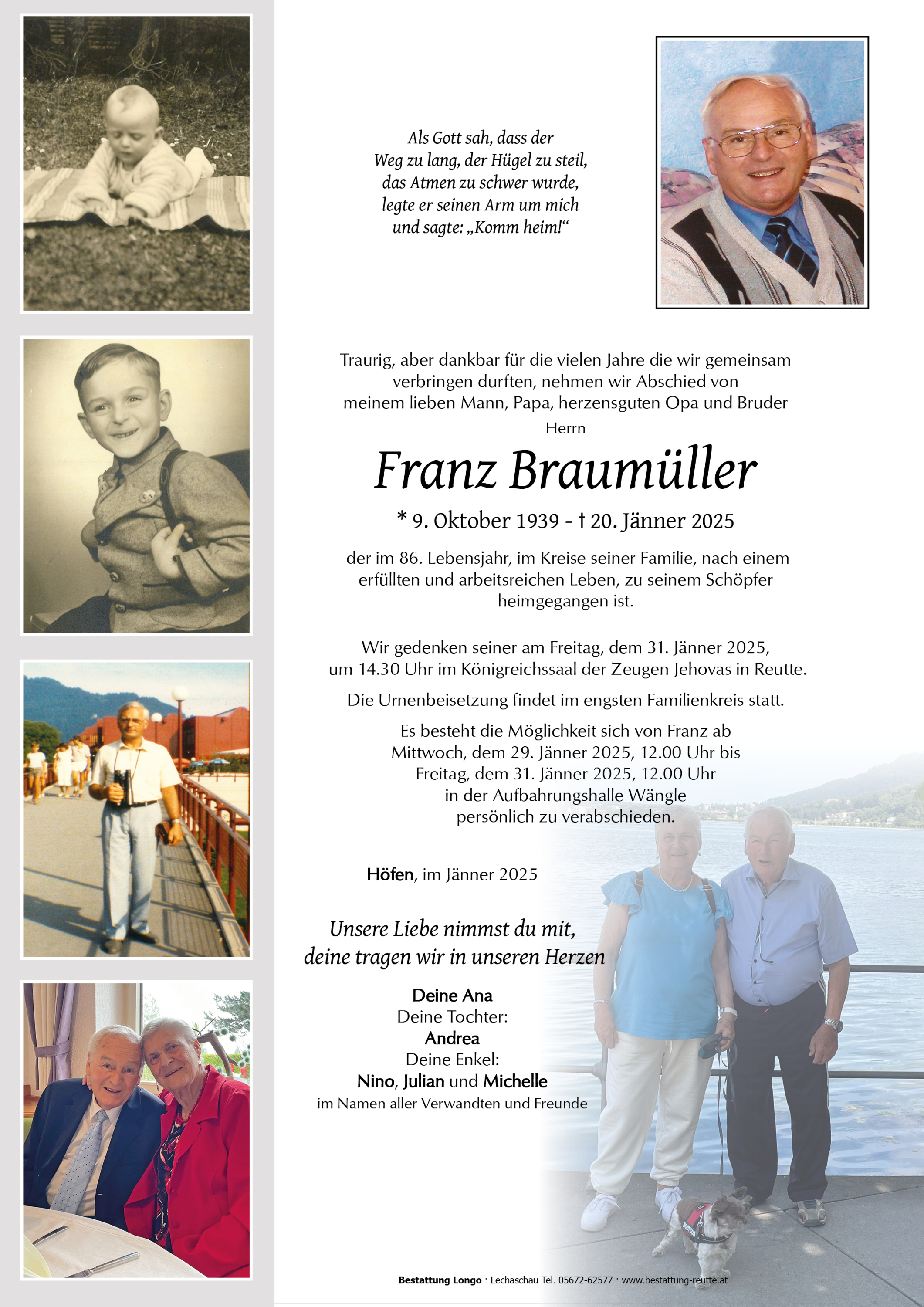 Auf diesem Wege möchten wir euch ALLEN unser aufrichtiges Beileid ausdrücken! Das Leben ist leider vergänglich, doch die vielen schönen Erinnerungen bleiben für immer: Wir wünschen, dass euch die schönen Momente mit eurem Franz in dieser schweren Zeit viel Kraft spenden. Vielen lieben Dank für die vielen schönen Stunden bei euch und mit Euch! Wir alle freuen uns schon jetzt auf ein freudiges Wiedersehen in der Auferstehung!
