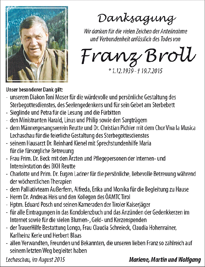 Aufrichtig Anteilnahme entbietet die ÖZIV-Bezirksgruppe Reutte.