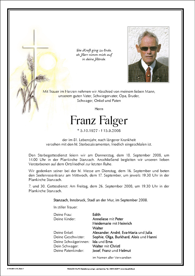 13.12.1901 15.09.2008 Stanzach Franz Falger Action Parte Gedenkkerzen Kondolenzen Parte Gedenkkerzen Kondolenzen Parte herunterladen Gedenkkerzen für Franz Falger 0 Einträge Kerze anzünden Ihre Gedenkkerze fürFranz Falger Ihr Name* Farbe auswählen Ihre Nachricht oder Name* E-Mail-Adresse* Mit dem Klicken auf "Kerze anzünden" erklären Sie sich mit unseren Datenschutzbestimmungen einverstanden. Kondolenzbuch für Franz Falger 0 Einträge Kondolenz verfassen Ihr Abschiedsgruß an Franz Falger Ihr Name* E-Mail-Adresse* Ihre Nachricht* Mit dem Klicken auf "Gruß absenden" erklären Sie sich mit unseren Datenschutzbestimmungen einverstanden.