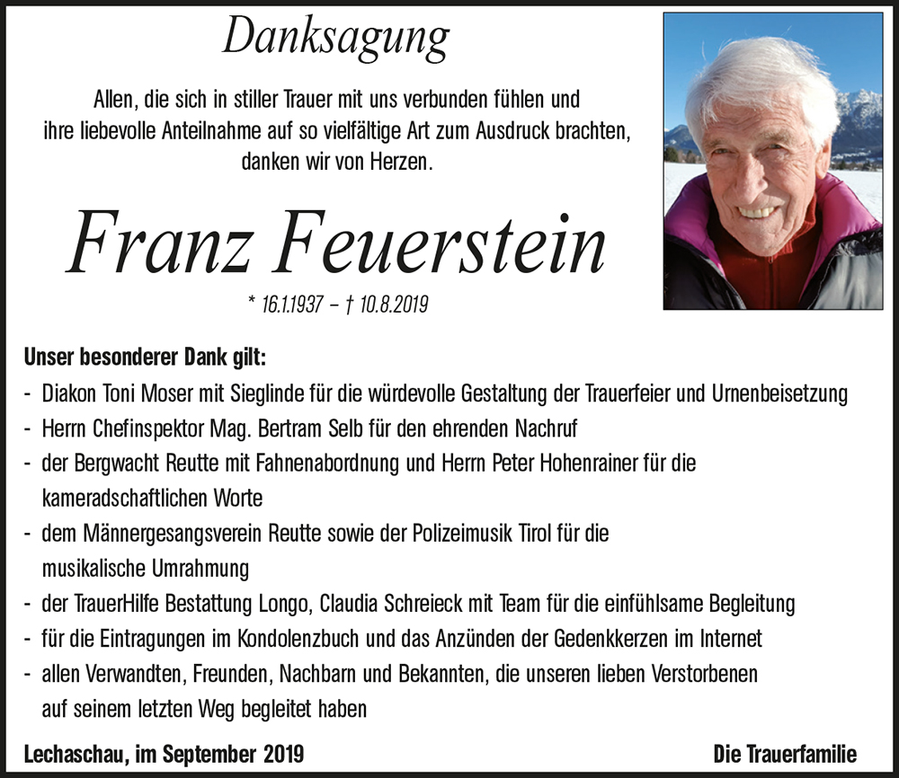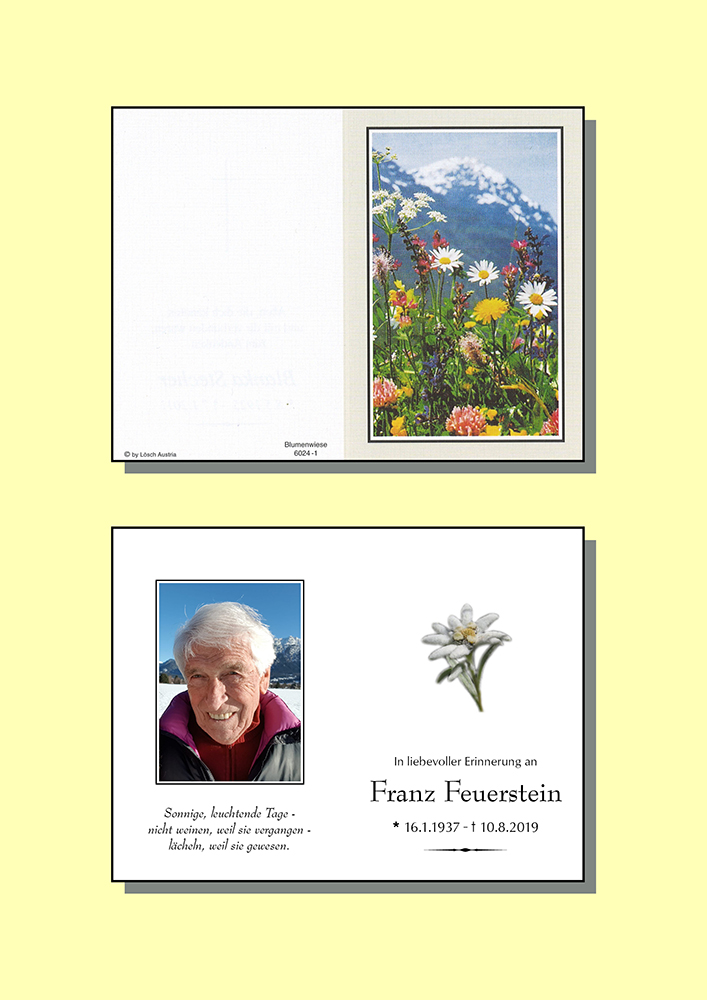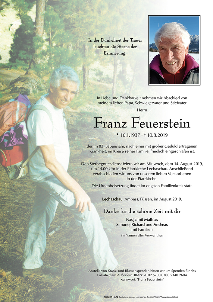 Liebe Nadja und geehrte Trauerfamilie. Franz war uns immer ein lieber Freund und ich bin so froh, dass ich ihm bei unserem letzten Besuch nochmals über sein weißes Haar streichen durfte. Ich weiß, er hat auch uns gemocht. Schade, daß alles im Leben vergänglich ist, auch das Schöne. Wir werden ihn nie vergessen. Zum Glück haben wir eine Menge Fotos als schöne Erinnerungen. Vielen vielen Dank.