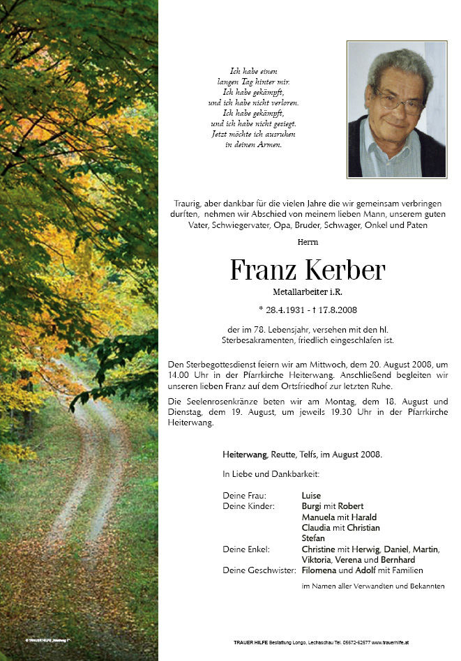 13.12.1901 17.08.2008 Heiterwang Franz Kerber Action Parte Gedenkkerzen Kondolenzen Parte Gedenkkerzen Kondolenzen Parte herunterladen Gedenkkerzen für Franz Kerber 0 Einträge Kerze anzünden Ihre Gedenkkerze fürFranz Kerber Ihr Name* Farbe auswählen Ihre Nachricht oder Name* E-Mail-Adresse* Mit dem Klicken auf "Kerze anzünden" erklären Sie sich mit unseren Datenschutzbestimmungen einverstanden. Kondolenzbuch für Franz Kerber 0 Einträge Kondolenz verfassen Ihr Abschiedsgruß an Franz Kerber Ihr Name* E-Mail-Adresse* Ihre Nachricht* Mit dem Klicken auf "Gruß absenden" erklären Sie sich mit unseren Datenschutzbestimmungen einverstanden.
