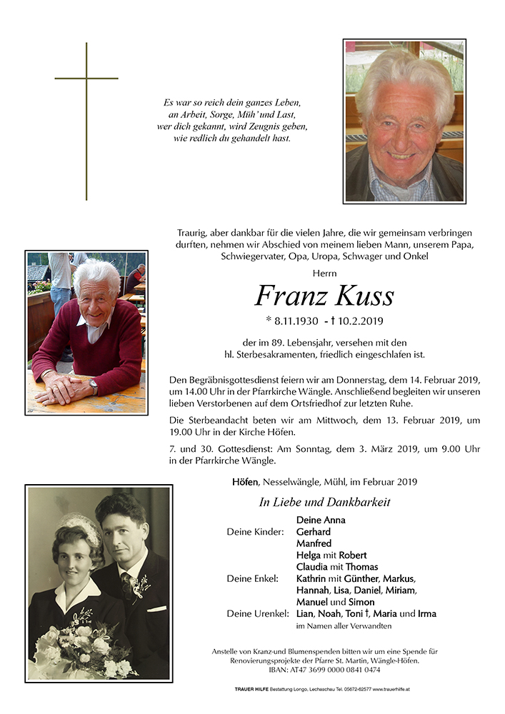 einige Jahre durften wir als Untermieter in eurem Haus wohnen. Sehr oft und gerne denke an diese Zeit zurück. Die Jahre vergehen, wir werden älter und einmal kommt der Tag an dem wir uns von allem was uns lieb geworden ist, verabschieden müssen. Es tut mir sehr leid dass nun auch für euch der Tag des Abschiednehmens von deinem Mann und eurem Papa gekommen ist. Ich werde Franz in guter Erinnerung behalten und werde ihn und euch ins Gebet einschliessen.