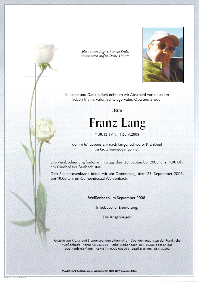 13.12.1901 20.09.2008 Weißenbach am Lech Franz Lang Action Parte Gedenkkerzen Kondolenzen Parte Gedenkkerzen Kondolenzen Parte herunterladen Gedenkkerzen für Franz Lang 3 Einträge Kerze anzünden In stillem Gedenken, Silvia Ruhe in Frieden Franz Ingrid + Bruno Posch Wbch. Ihre Gedenkkerze fürFranz Lang Ihr Name* Farbe auswählen Ihre Nachricht oder Name* E-Mail-Adresse* Mit dem Klicken auf "Kerze anzünden" erklären Sie sich mit unseren Datenschutzbestimmungen einverstanden. Kondolenzbuch für Franz Lang 0 Einträge Kondolenz verfassen Ihr Abschiedsgruß an Franz Lang Ihr Name* E-Mail-Adresse* Ihre Nachricht* Mit dem Klicken auf "Gruß absenden" erklären Sie sich mit unseren Datenschutzbestimmungen einverstanden.