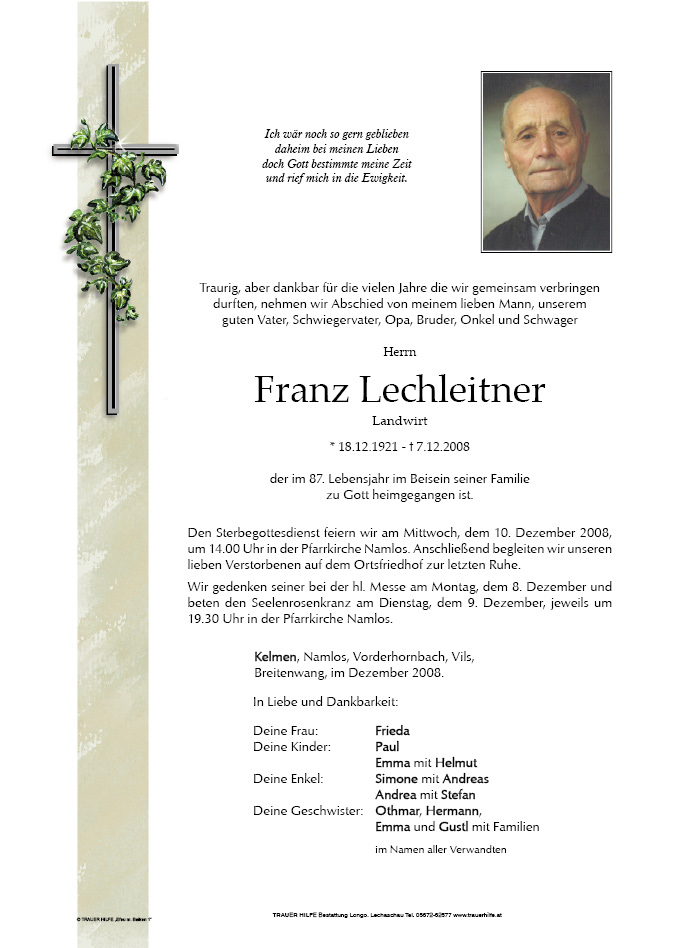 13.12.1901 07.12.2008 Namlos Franz Lechleitner Action Parte Gedenkkerzen Kondolenzen Parte Gedenkkerzen Kondolenzen Parte herunterladen Gedenkkerzen für Franz Lechleitner 1 Eintrag Kerze anzünden Alles Gute Ihre Gedenkkerze fürFranz Lechleitner Ihr Name* Farbe auswählen Ihre Nachricht oder Name* E-Mail-Adresse* Mit dem Klicken auf "Kerze anzünden" erklären Sie sich mit unseren Datenschutzbestimmungen einverstanden. Kondolenzbuch für Franz Lechleitner 0 Einträge Kondolenz verfassen Ihr Abschiedsgruß an Franz Lechleitner Ihr Name* E-Mail-Adresse* Ihre Nachricht* Mit dem Klicken auf "Gruß absenden" erklären Sie sich mit unseren Datenschutzbestimmungen einverstanden.