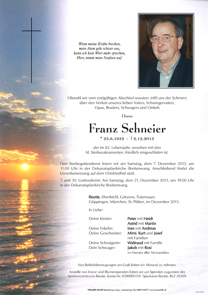 Mit dem Tod verliert man vieles aber wir denken an die schöne Zeit mit Franz zurück und trotz aller Trauer huscht ein Lächeln über unser Gesicht an die vielen unvergessenen Stunden.