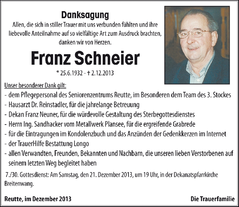 Mit dem Tod verliert man vieles,aber wir denken an die schöne Zeit mit Franz zurück und es huscht trotz aller Trauer ein Lächeln über unser Gesicht.
