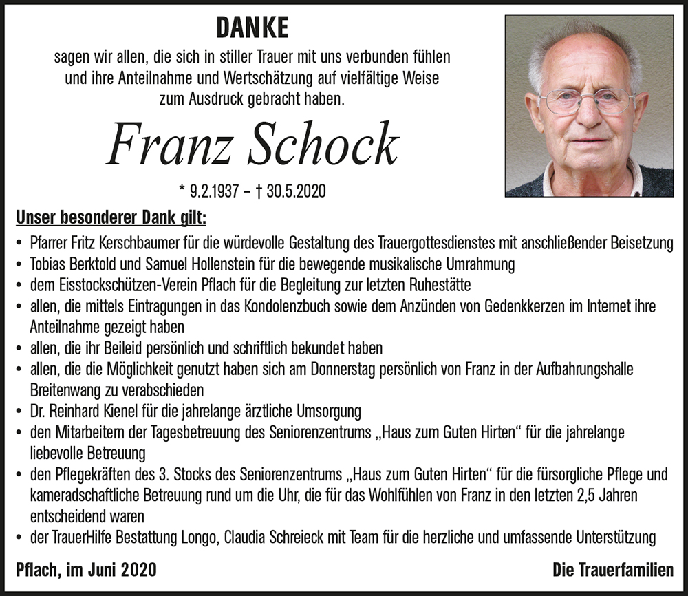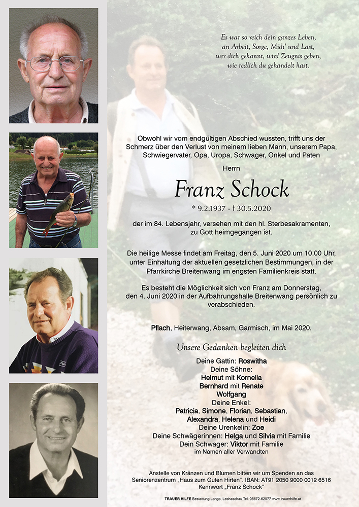 Liebe Trauerfamilie, ich lernte Franz als einen sehr geradlinigen Chef kennen und schÀtzen. Seine energische, akkurate und gewissenhafte Arbeitsweise in Kombination mit seinem Humor und seinem aufrichtigen Interesse an seinen Mitmenschen wird mir unvergesslich bleiben! Lieber Franz, ruhe in Frieden!