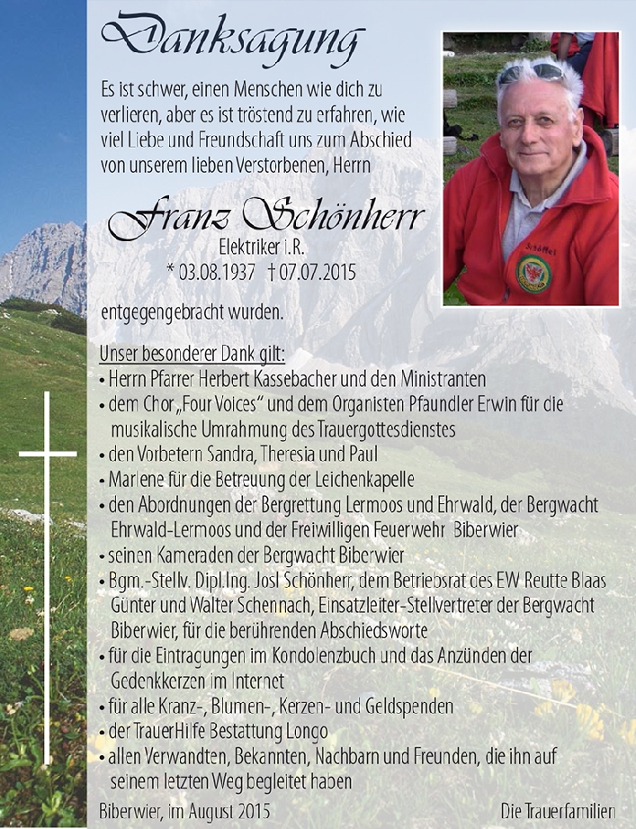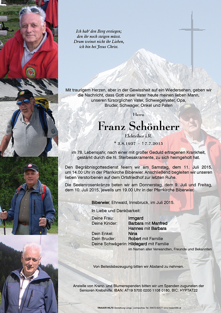 Wir haben Franz als einen frohen und lebenslustigen Menschen erfahren dürfen, der seine Berge und Natur über alles schätzte. Und das ist es, wie wir Franz immer in Erinnerung behalten werden.