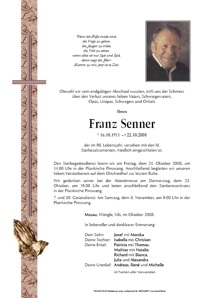13.12.1901 22.10.2008 Musau Franz Senner Action Parte Gedenkkerzen Kondolenzen Parte Gedenkkerzen Kondolenzen Parte herunterladen Gedenkkerzen für Franz Senner 67 Einträge Kerze anzünden Du fehlst mir! Ein Licht für dich Osterkerze Pass guat auf uns auf A weihnachtslichtle für di Pass auf uns auf A Weihnachtslichtl für dich Pass auf uns auf Denke an dich Denke an dich Pass auf uns auf A Weihnachtslichterl - Pass auf uns auf Denke an dich Denke an dich pass auf uns auf Papa a Weihnachtslichtle für di a Lichtle für di Isa Denk an Dich a Kerze für dich - du fehlst Denk an Dich Schau auf uns Alle Papa In Gedanken bei uns a Weihnachtslichtle für Dich Denk an Dich ruhe in Frieden Denke an Dich Unvergessen Denke an Dich . . . lass es gut ausgehen, schau auf uns Denke an Dich in gedanken bei dir du fehlst mir immer noch In gedanken bei dir papa In Gedanken bei Dir Isa pass bitte auf uns auf Habs fein wo du jetzt bist A Osterlicht und Danke fehlst uns du fehlst mir Papa denk an Dich Bitte schaue auf uns a Lichtle fur die Familie a Weihnachtslichtle für Dich Beschütze uns Denke an dich wir denken an dich denke heute an dich Denke an dich Andreas und Patricia pass auf uns auf! ! ! in Gedanken in Liebe Patricia und Andreas achte auf uns beschütze und hilf uns Patricia in Liebe Weihnachtskerze Andi hilf uns! ! ! ! denke an dich papa ein licht für dich in Dankbarkeit . . . eine KERZE für DICH. . . Ein Licht für Dich zum Advent RUHE IN FRIEDEN FRANZ Fam. Georg Wörle Patricia Thomas und Andreas Patricia und Andi zum Andenken Patricia Ihre Gedenkkerze fürFranz Senner Ihr Name* Farbe auswählen Ihre Nachricht oder Name* E-Mail-Adresse* Mit dem Klicken auf "Kerze anzünden" erklären Sie sich mit unseren Datenschutzbestimmungen einverstanden. Kondolenzbuch für Franz Senner 0 Einträge Kondolenz verfassen Ihr Abschiedsgruß an Franz Senner Ihr Name* E-Mail-Adresse* Ihre Nachricht* Mit dem Klicken auf "Gruß absenden" erklären Sie sich mit unseren Datenschutzbestimmungen einverstanden.