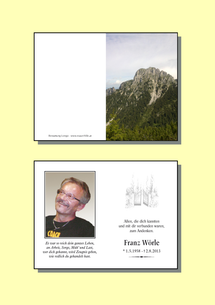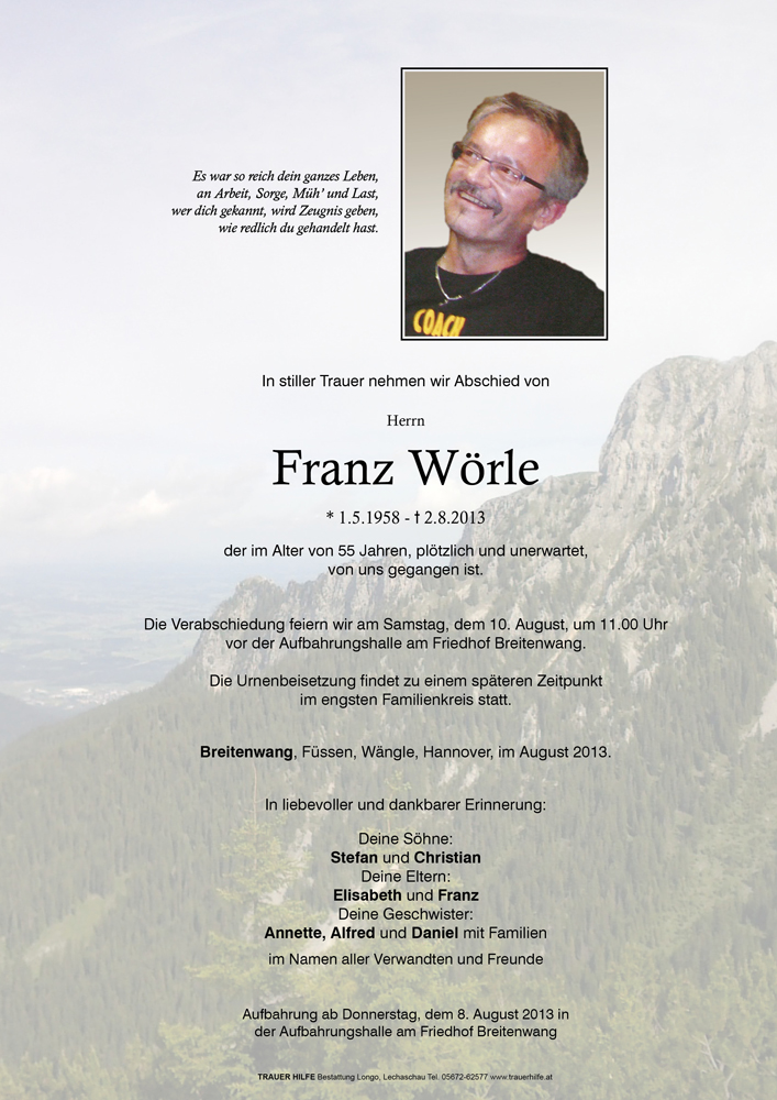 Ich denke an Franz, der ein lieber Enkel unsrer lieben Lina Wörle war, die lange Zeit bei uns im Pfarrhaus gelebt hat. Wenn Ihr zu Verabschiedung eine Hilfe möchtet, dann ruft bei mir an. In Verbundenheit Ernst Pohler, Altdekan: