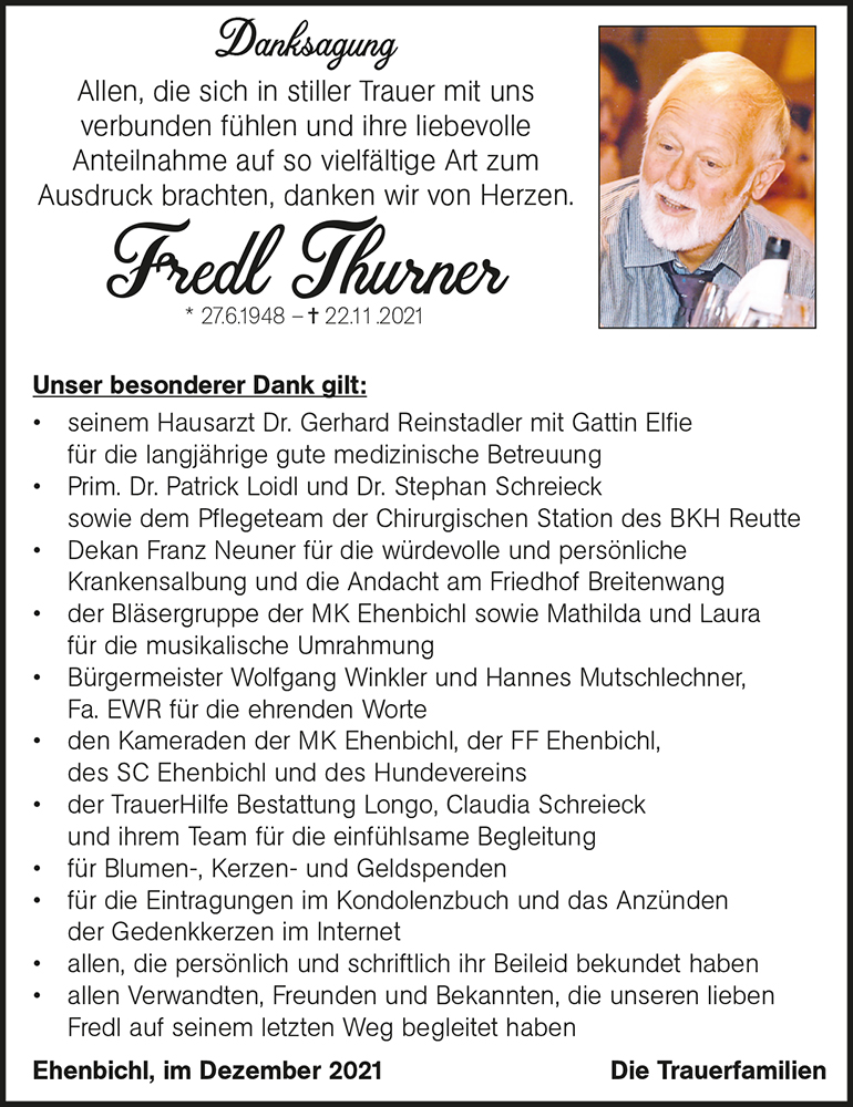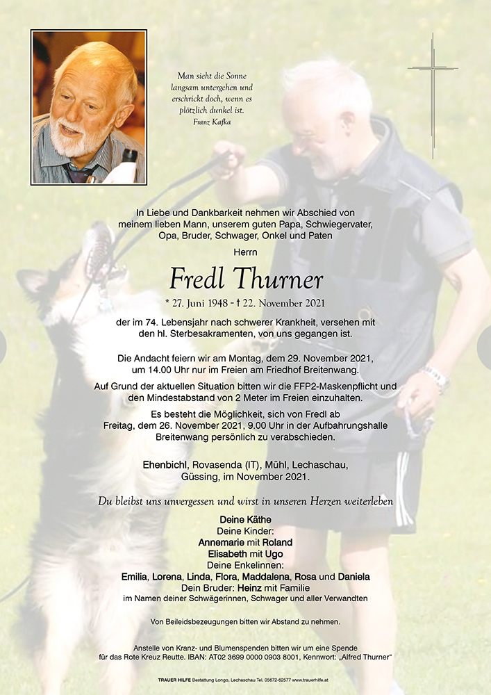 tief betroffen über die Nachricht vom Tod von "Fredl“ möchte ich Euch mein tiefstes Mitgefühl und Beileid ausdrücken.