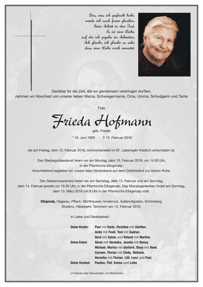 Kondolenzbuch für Frieda Hofmann